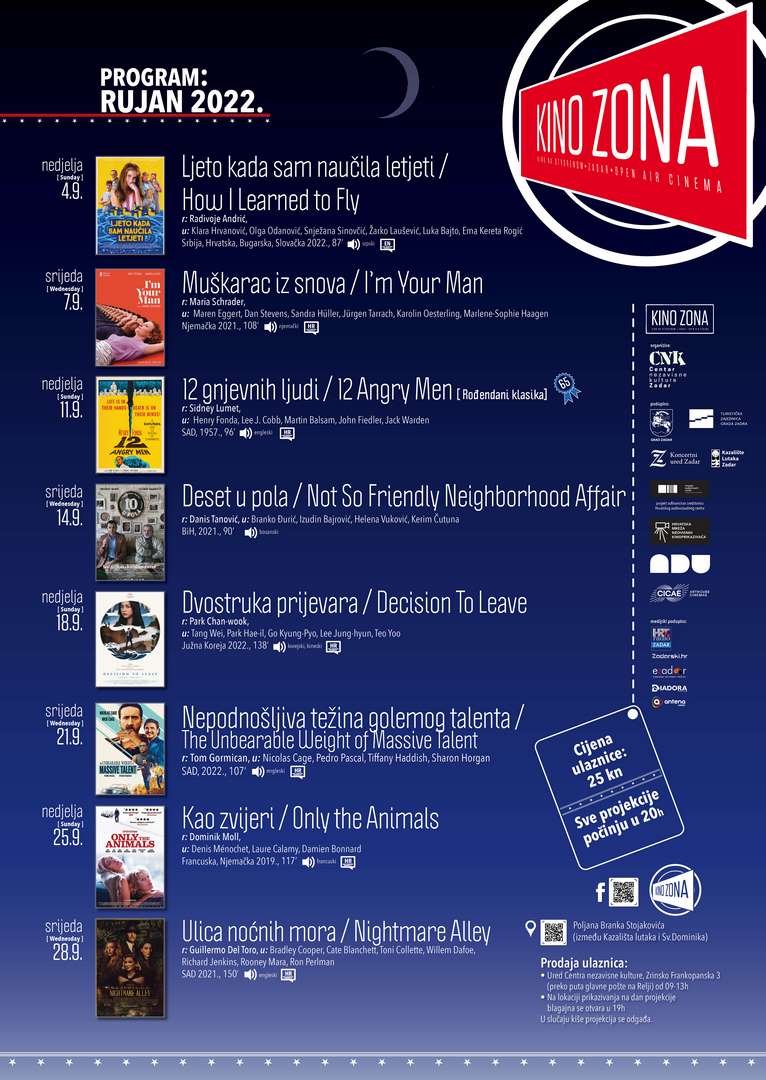 ”Ljeto kada sam naučila letjeti” je na rasporedu u nedjelju 04. rujna s početkom od 20h, a do kraja rujna na ljetnoj pozornici moći ćete još pogledati i njemačku romantičnu komičnu dramu s elementima znanstvene fantastike ”Muškarac iz snova” Marie Schrader (srijeda 07. rujna), klasičnu krimi dramu ‘’12 gnjevnih ljudi” Sidneya Lumeta koji obilježava 65 godina od premijernog prikazivanja (nedjelja 11. rujna), komičnu dramu ”Deset u pola” Danisa Tanovića” (srijeda 14. rujna), južnokorejskog pobjednika festivala u Cannesu, krimi misteriju ”Dvostruka prijevara” Chan-wook Parka (nedjelja 18. rujna), akcijsku komediju ”Nepodnošljiva težina golemog talenta” (srijeda 21. rujna), francusku krimi dramu ”Kao zvijeri” (nedjelja 25. rujna) i za sam kraj, noir triler krimić ”Ulica noćnih mora” Guillerma Del Toroa koja je na rasporedu u srijedu 28. rujna.