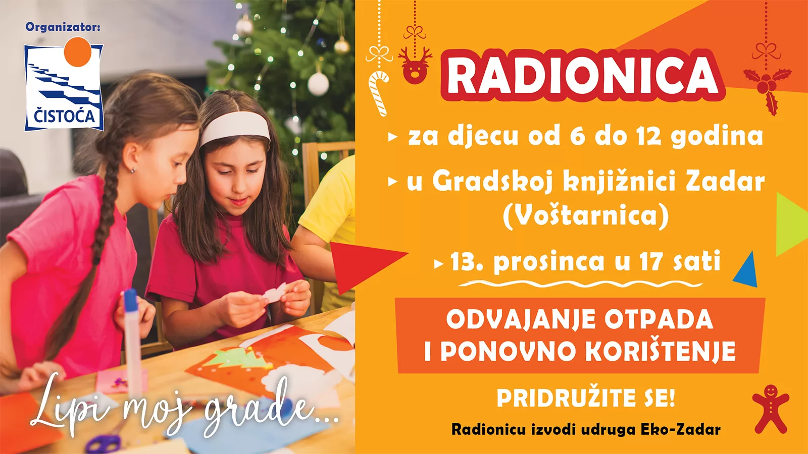 Ovim putem najavljujemo i radionicu koja će se održati 13.12.2022., s početkom u 17 sati u Gradskoj knjižnici Zadar, a na kojoj će svi zainteresirani pripadnici dobne skupine 6 – 12 godina moći doći i sudjelovati u izradi novih, korisnih stvari od starih, odbačenih, otpadnih predmeta.