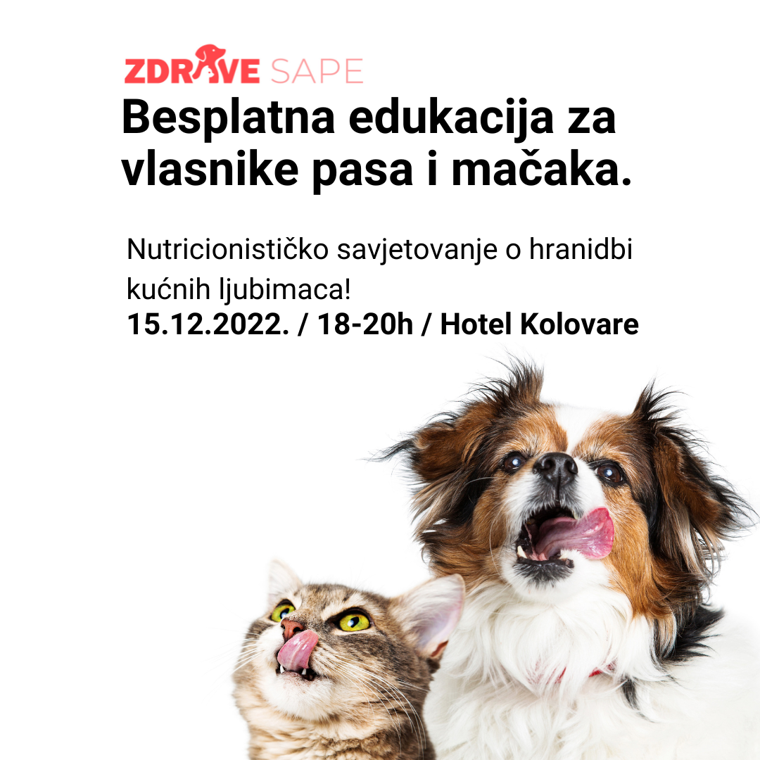 Udruga i Prvi Nutricionistički centar za kućne ljubimce “Zdrave Šape” sutra 15.12.2022. u terminu 18-20h, na lokaciji Hotel Kolovare, održavaju BESPLATNO “Prvo nutricionističko savjetovanje vlasnika kućnih ljubimaca” u Zadarskoj županiji. Dr.med.vet.Petra Papišta održati će za sve zainteresirane vlasnike pasa i mačaka besplatno savjetovanje vezano za pravilnu hranidbu kućnih ljubimaca, a nakon predavanja moguće su besplatne individualne konzultacije za vlasnike čiji ljubimci imaju problema sa hranidbom, odnosno koji imaju gastrointestinalne, dermatološke i druge probleme.