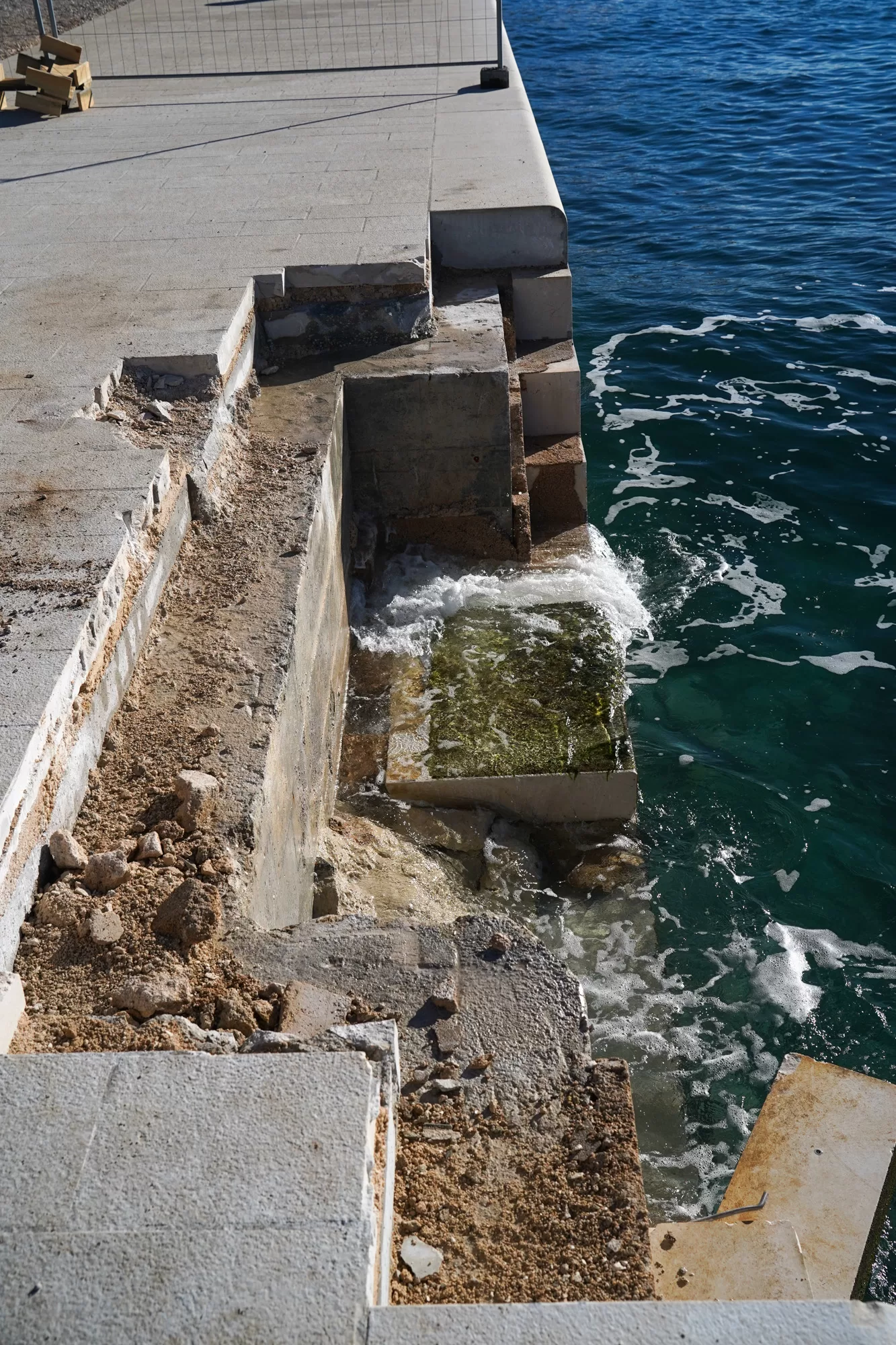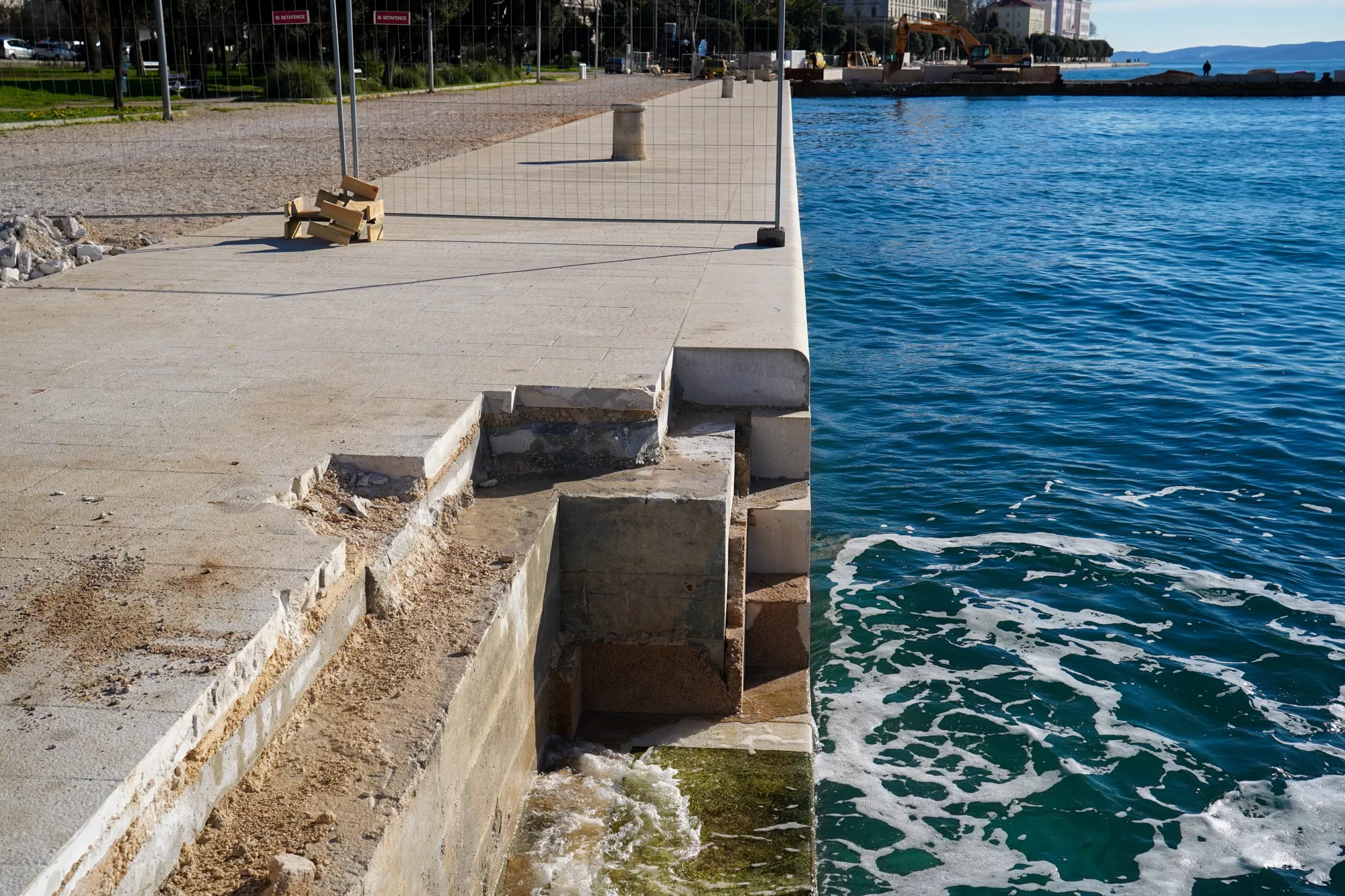 Dakle, problem je nastao kad su jedne od stepenica postavljene na krivu stranu, kao i ograda. Zbog toga se sad ponovno vade blokovi, a ograda je maknuta kako bi se ispravila ova greška izvođača radova.