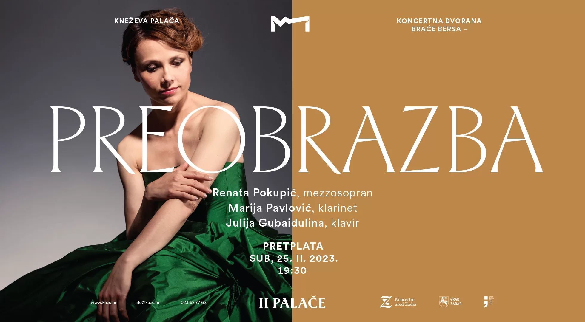 Iz Koncertnog ureda Zadar javljaju da je zbog bolesti jedne od glazbenica odgađen koncert mezzosopranistice Renate Pokupić, klarinetistice Marija Pavlović i pijanistice Julije Gubaiduline.