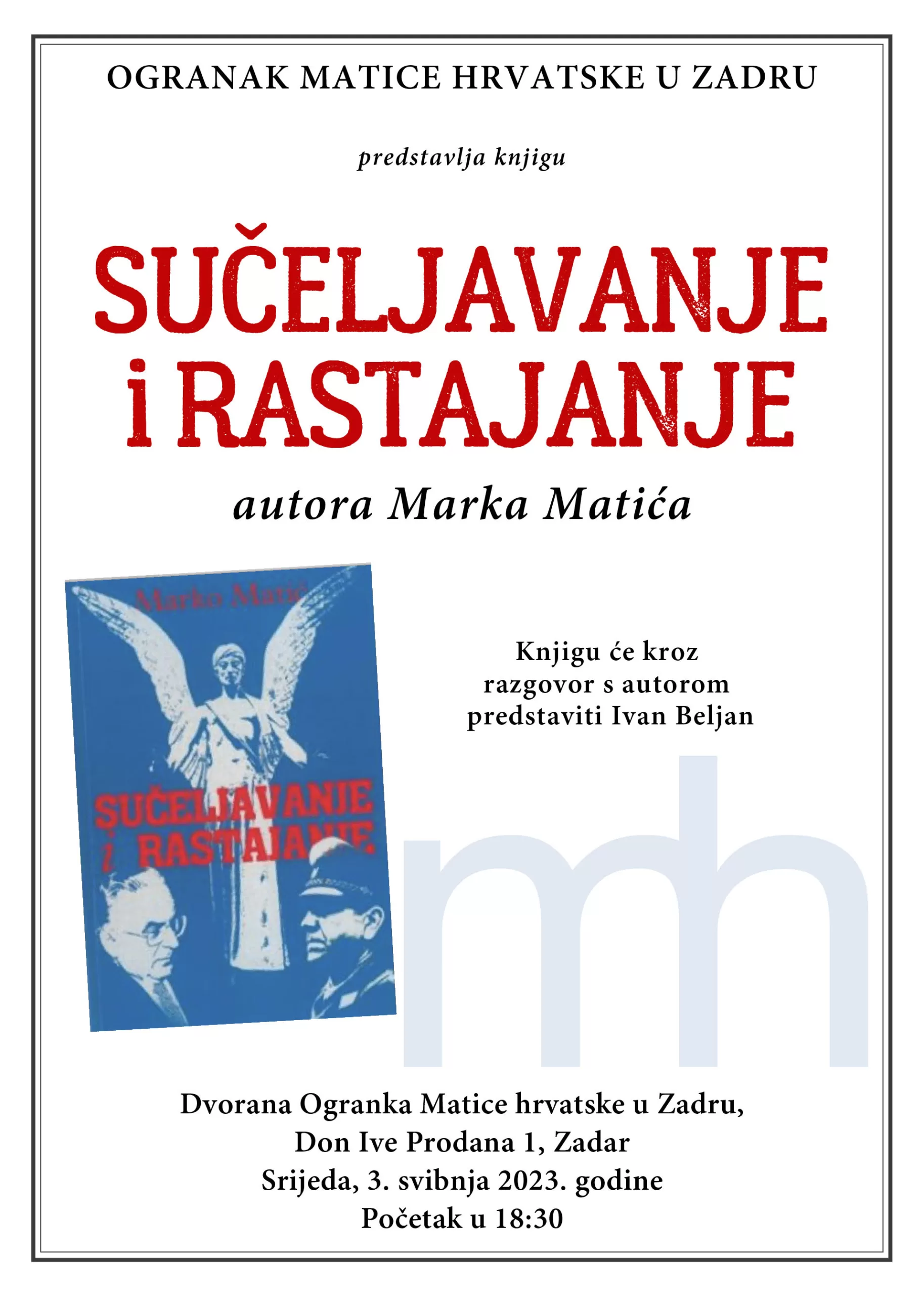 Ogranak Matice hrvatske u Zadru predstavlja knjigu Marka Matića: “Sučeljavanje i rastajanje”. Knjigu će kroz razgovor s autorom predstaviti Ivan Beljan, stradalnik, ratnik, brigadir HV-a, publicist i društveno-politički aktivist.