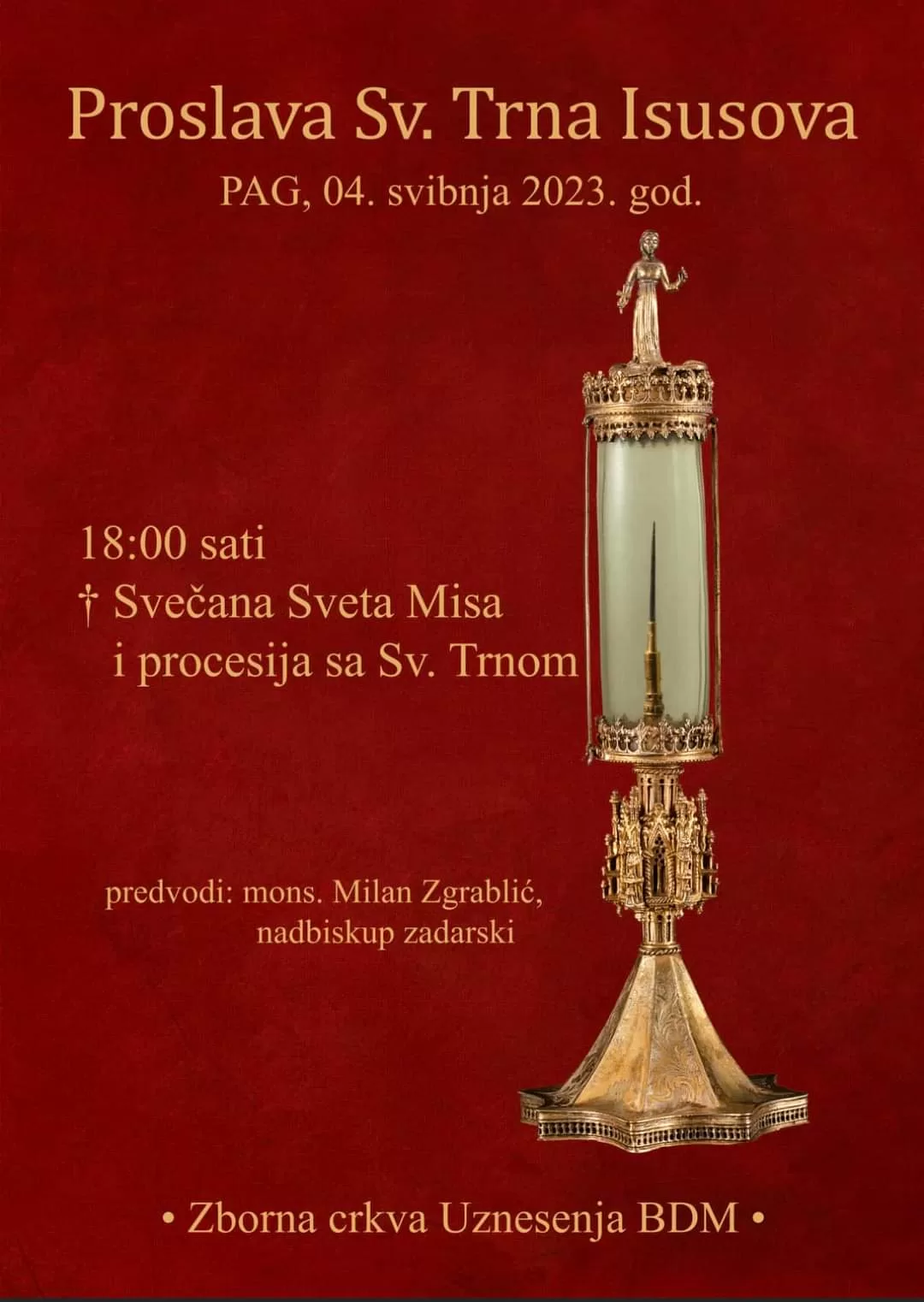 U četvrtak, 4. svibnja 2023. godine održat će se proslava Svetog Trna u gradu Pagu. Svečano misno slavlje u Zbornoj crkvi Uznesenja Blažene djevice Marije u 18 sati predvodit će mons. Milan Zgrablić, zadarski nadbiskup, a nakon svete mise održat će se i procesija sa Svetim Trnom ulicama grada Paga.