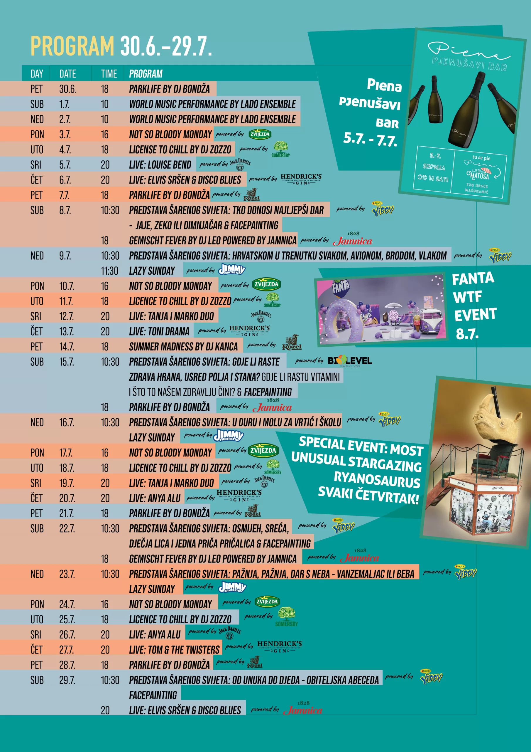 Osim u autentičnim okusima Italije, posjetitelji će na lokaciji manifestacije moći probati i nešto od raznovrsne ponude u ukupno šest kućica. Costa za ljubitelje meksičkih okusa nudi ukusne, hrskave, bogate i neodoljive tortilje, quesadille punjene povrćem, sirom te domaćom piletinom. Za osvježenje će se pripremati prirodne limunade s okusima manga, mente, đumbira i maline, te odlični kokteli od kojih se svakako ističe mojito-mango i mojito s malinama, jagodama i đumbirom. Na Mažurancu će se naći i široka ponuda u potpunosti veganskih jela i to na kućica Cugeraj sa 100% plant-based jelima, kao što su vege burgeri, vege balls i vege hot dogovi. Za totalno osvježenje i užitak na nepcima, tu je domaća inačica banana breada posluženog sa svježim voćem i šlagom. A neće nedostajati niti vrhunskih i maštovito miksanih koktela, Spritz koktela s pjenušcem te najboljeg Hendricks gin-tonica. Na Shanku će se moći probati domaća varijanta popularnog Pulled pork Phillyja – marinirane trgane svinjetine u brioche pecivu s coleslaw salatom, prženim lukom i homemade BBQ umakom. Naravno, u BitBurger kućici pripremat će se uvijek omiljeni hamburgeri u sto kombinacija, uz zdrave batat krumpiriće i mnogo drugih delicija. Nema šanse da netko ostane gladan!