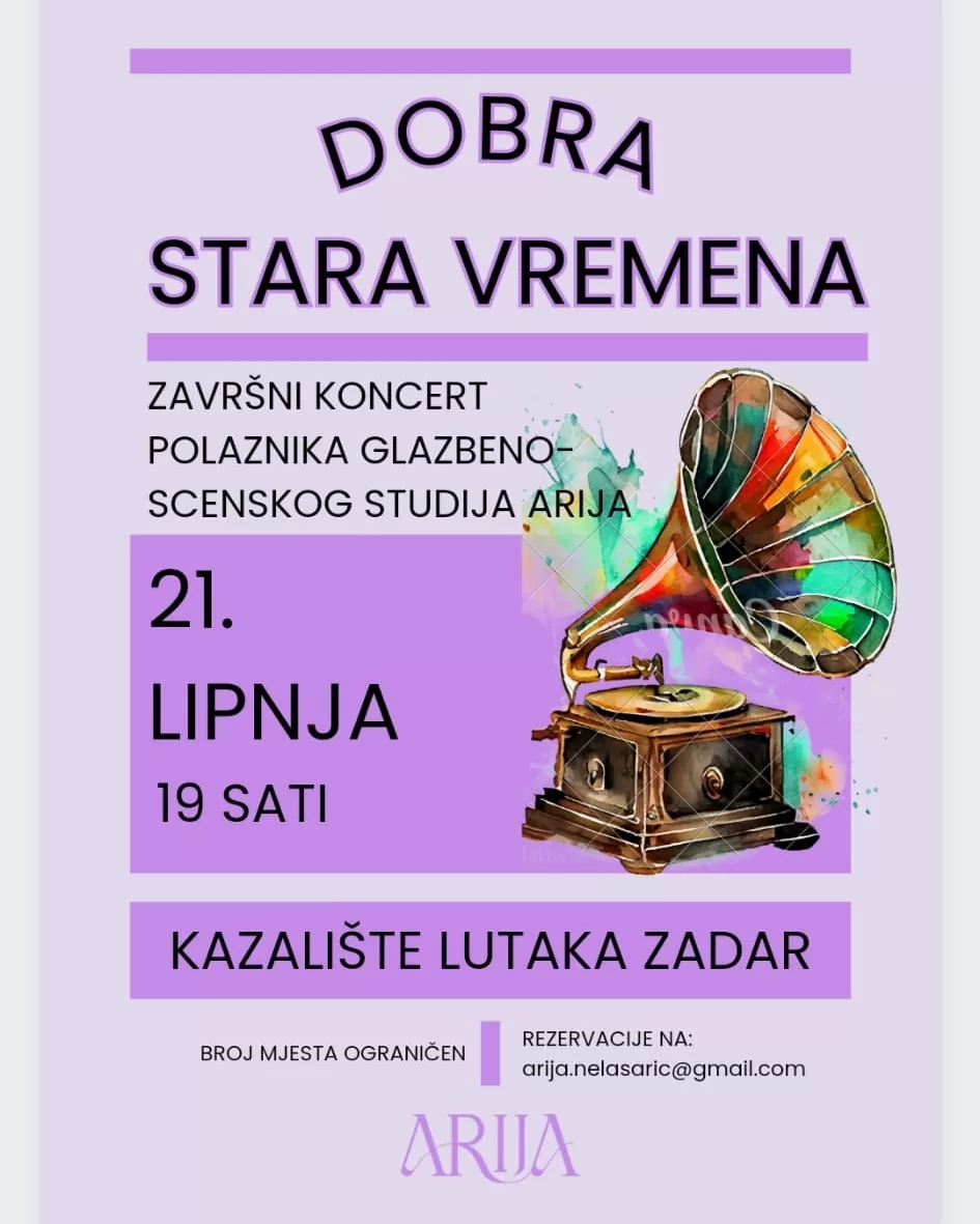 Glazbeno-scenski studio Arija poziva na završni koncert koji će biti održan u srijedu, 21.lipnja 2023. godine u Kazalištu lutaka Zadar u 19 sati.