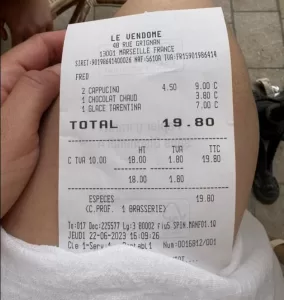 “Pozdrav iz Francuske, dva capuccina, kakao i mali sladoled u čašici”, napisala je i ispostavila račun na kojem piše iznos od 19,80 eura.
