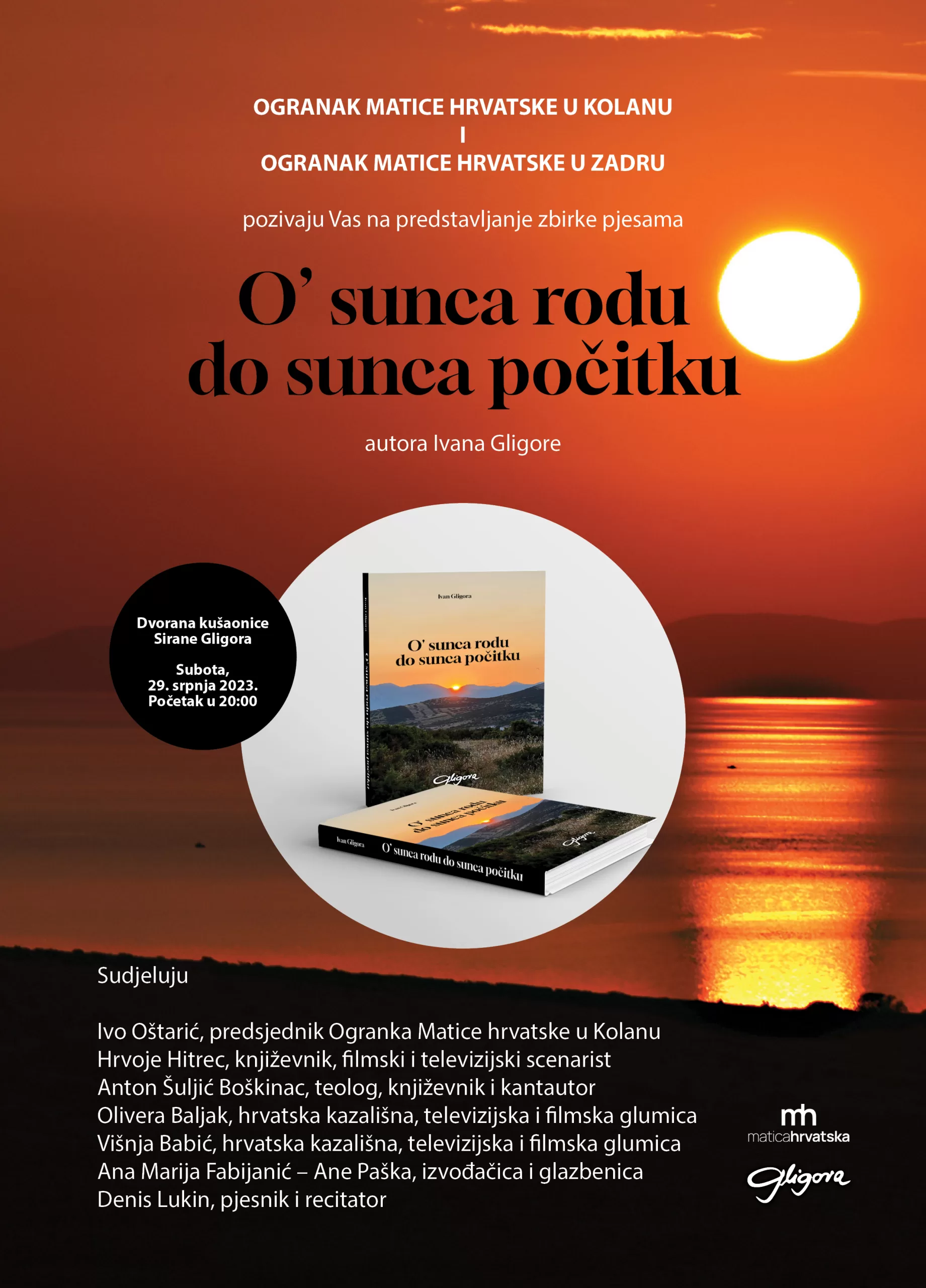 Ogranak Matice hrvatske u Kolanu i Ogranak Matice hrvatske u Zadru priređuju predstavljanje zbirke pjesama: “O’ sunca rodu do sunca počitku”, autora Ivana Gligore.