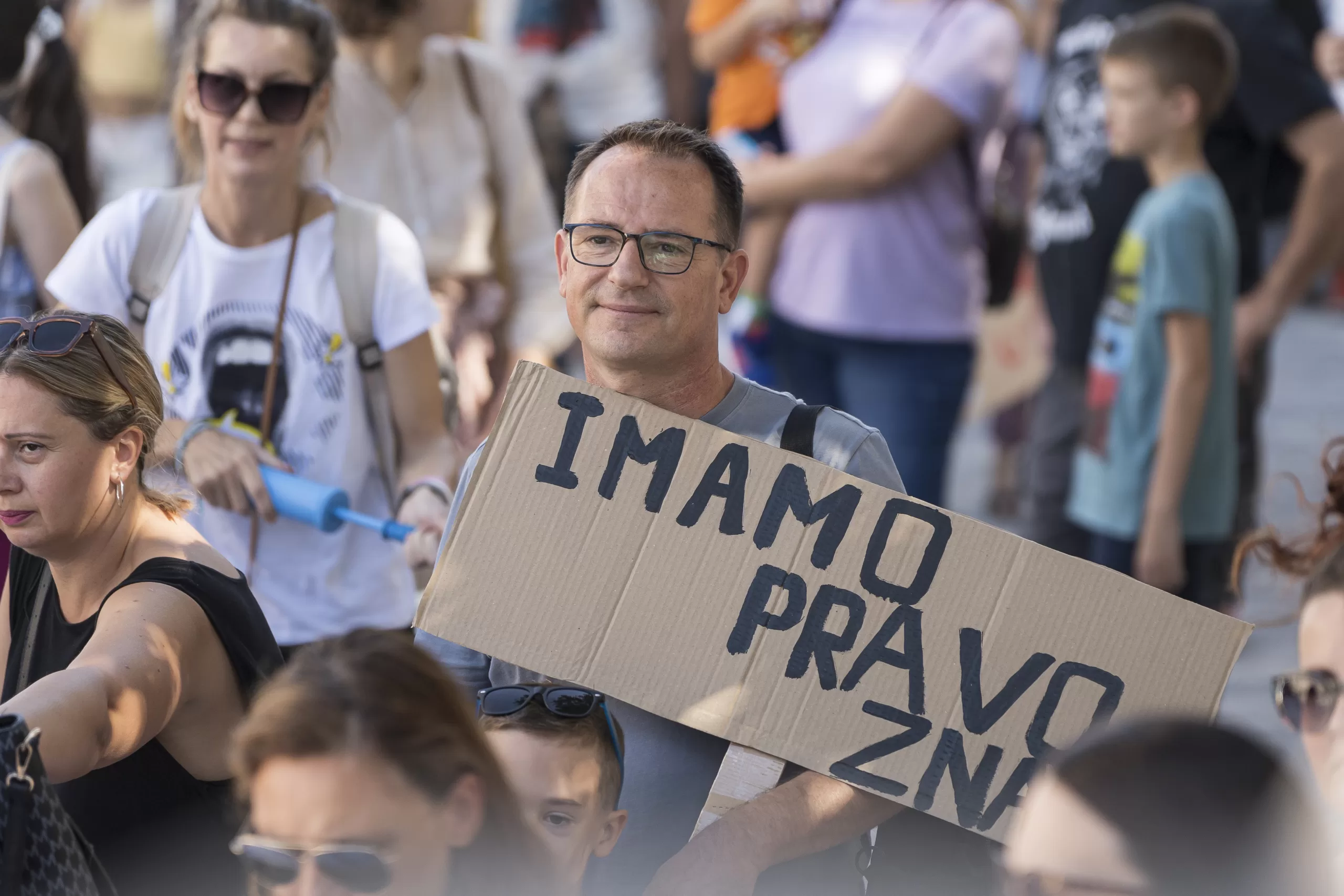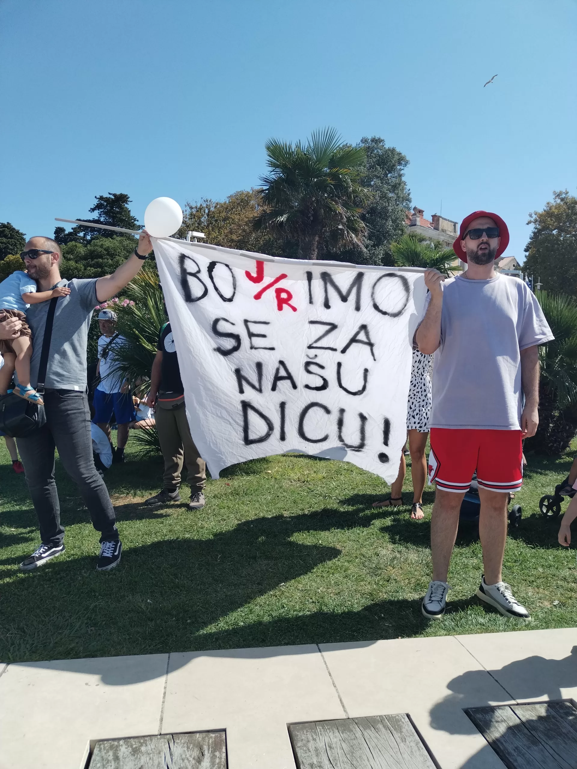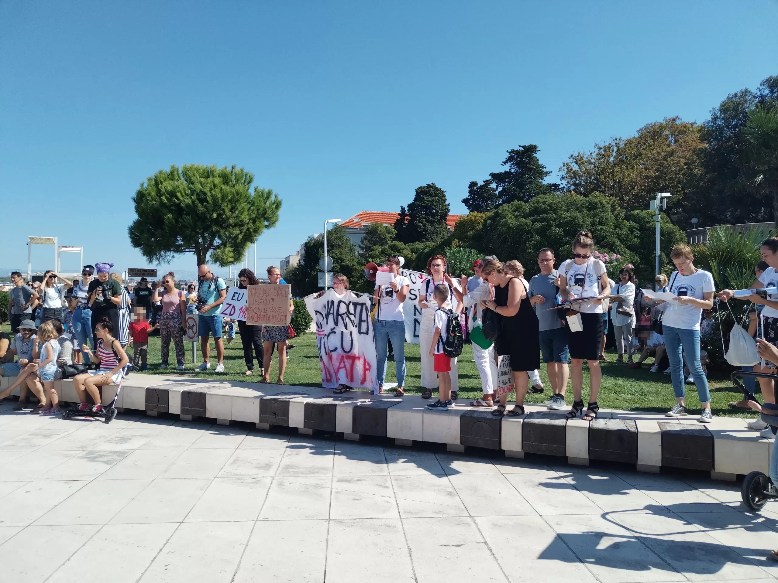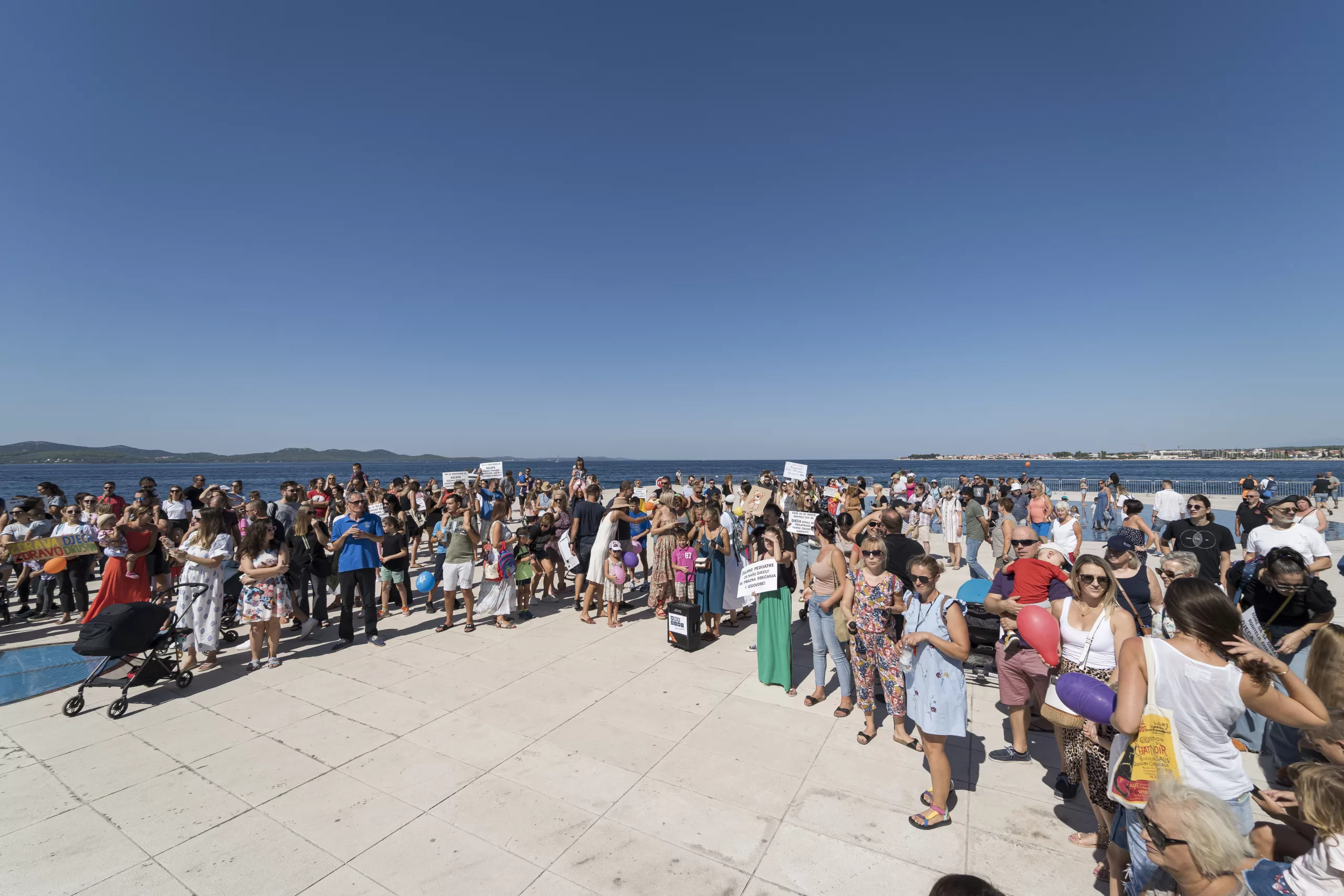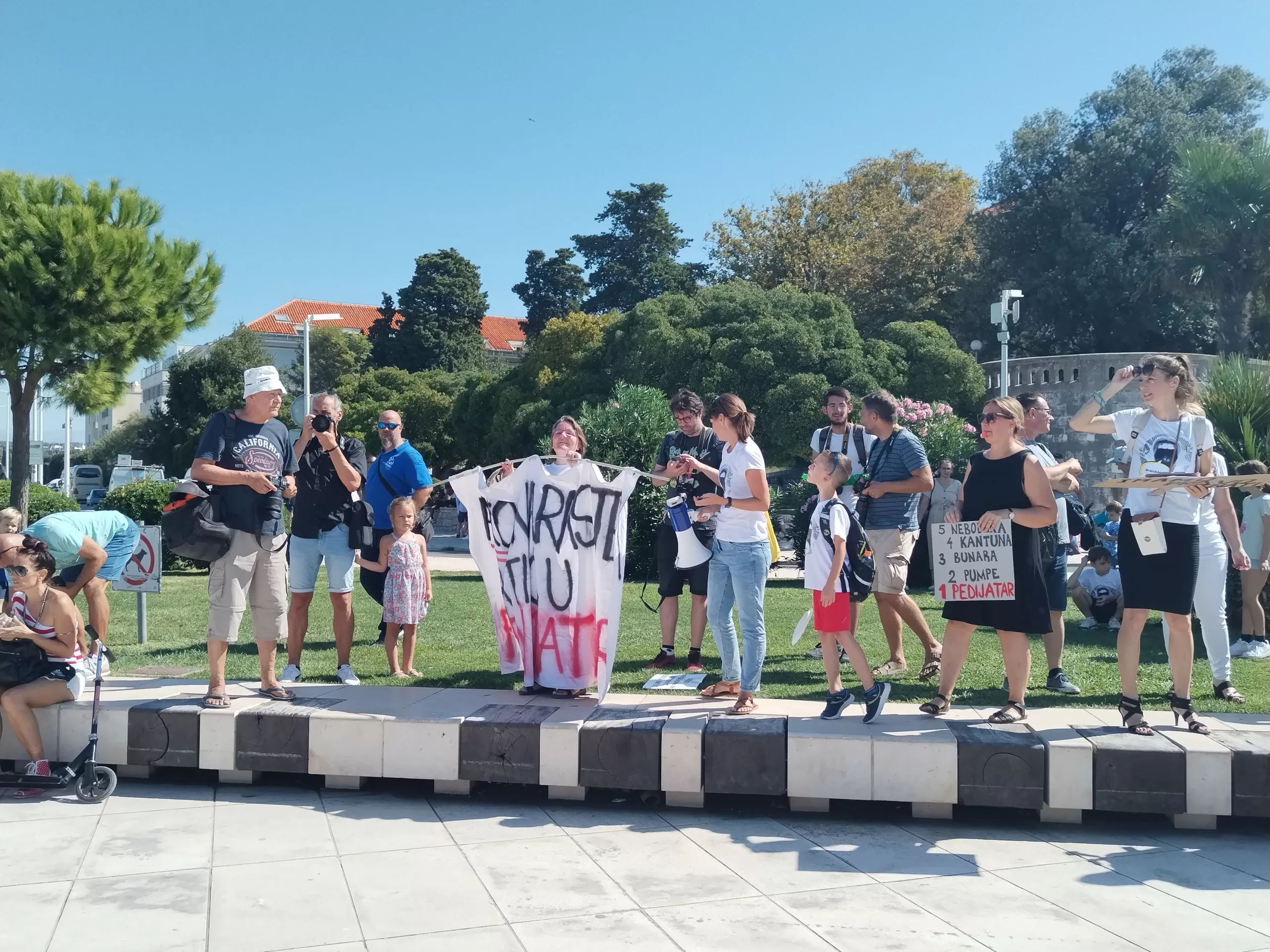 Okupljanje je započelo nešto prije 11 sati na Trgu pet bunara da bi potom velika povorka, uz zviždaljke i transparante, krenula Kalelargom prema Pozdravu Suncu.