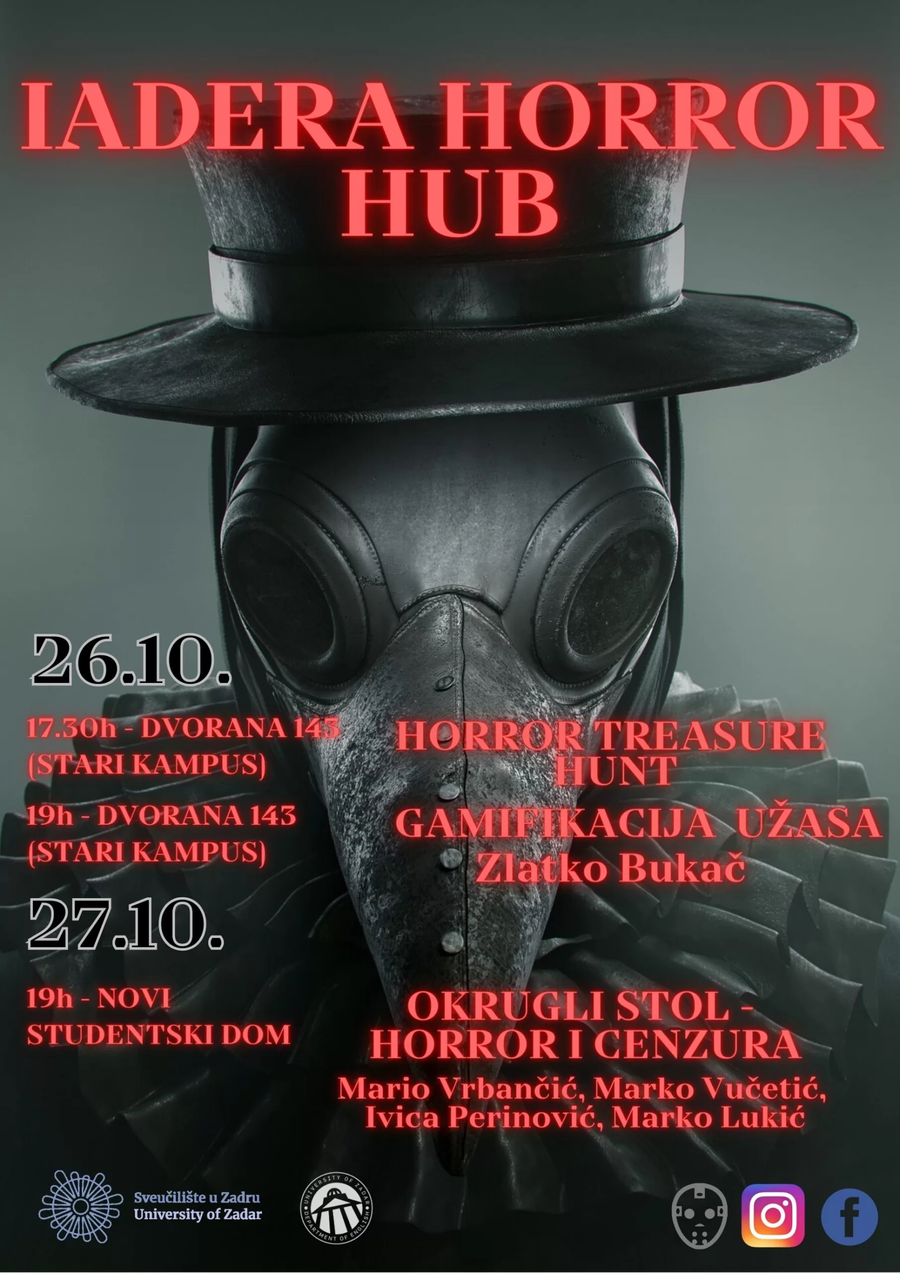 Iadera Horror Hub novi je projekt nastavnika/ca i studenata/ica Odjela za anglistiku posvećen analizi žanra horora stvaranjem inovativne platforme usmjerene akademski i ne-akademski orijentiranim ljubiteljima ovog uzbudljivog žanra.