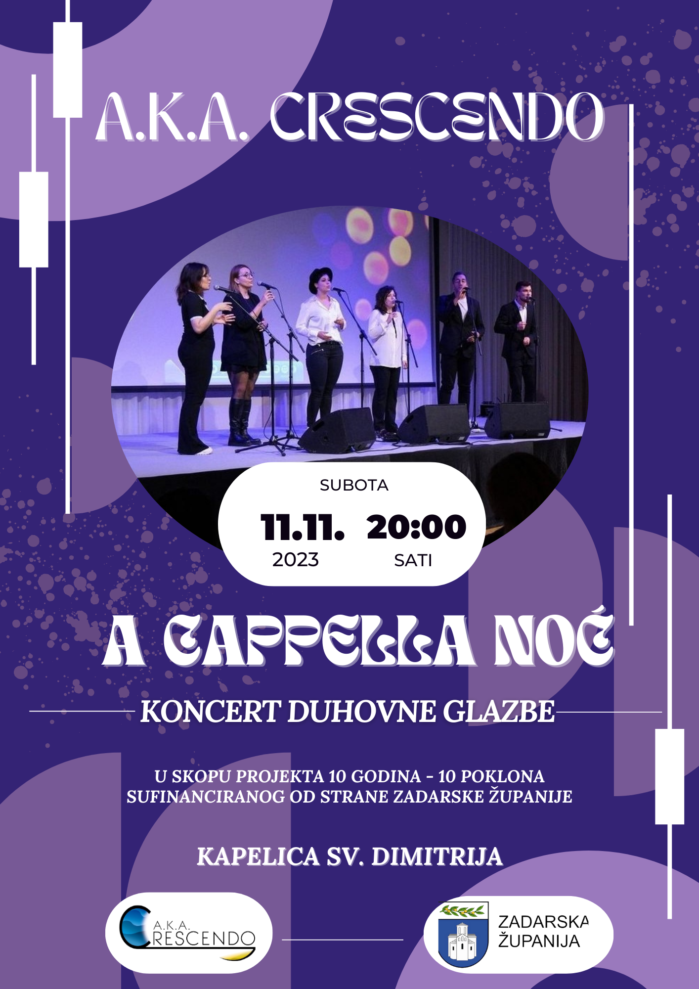 – I sada, ponosno vas pozivamo da budete dio nastavka te priče! Ove subote, 11.11. u 20 sati, ponovno ćemo zapjevati u sv. Dimitriju, ali ovaj put na vlastitom koncertu. Izvest ćemo obrade duhovnih pjesama koje smo tijekom proteklih 10 godina izvodili na različitim prigodama poput krštenja, vjenčanja i duhovnih koncerata. Odabrali smo najdraže nam duhovne pjesme kako bismo vam priredili poseban glazbeni doživljaj. Ovaj koncert dio je našeg projekta “10 godina – 10 poklona,” koji je sufinanciran od strane Zadarske županije, a njegov cilj je zahvaliti vama, našoj vjernoj publici, za deset godina podrške onako kako to najbolje znamo – pjesmom. Nadamo se da ćete nam se pridružiti ove subote i da ćemo zajedno uživati u ovoj a cappella noći ispunjenoj duhovnim zvucima i harmonijom, pozivaju iz grupe.