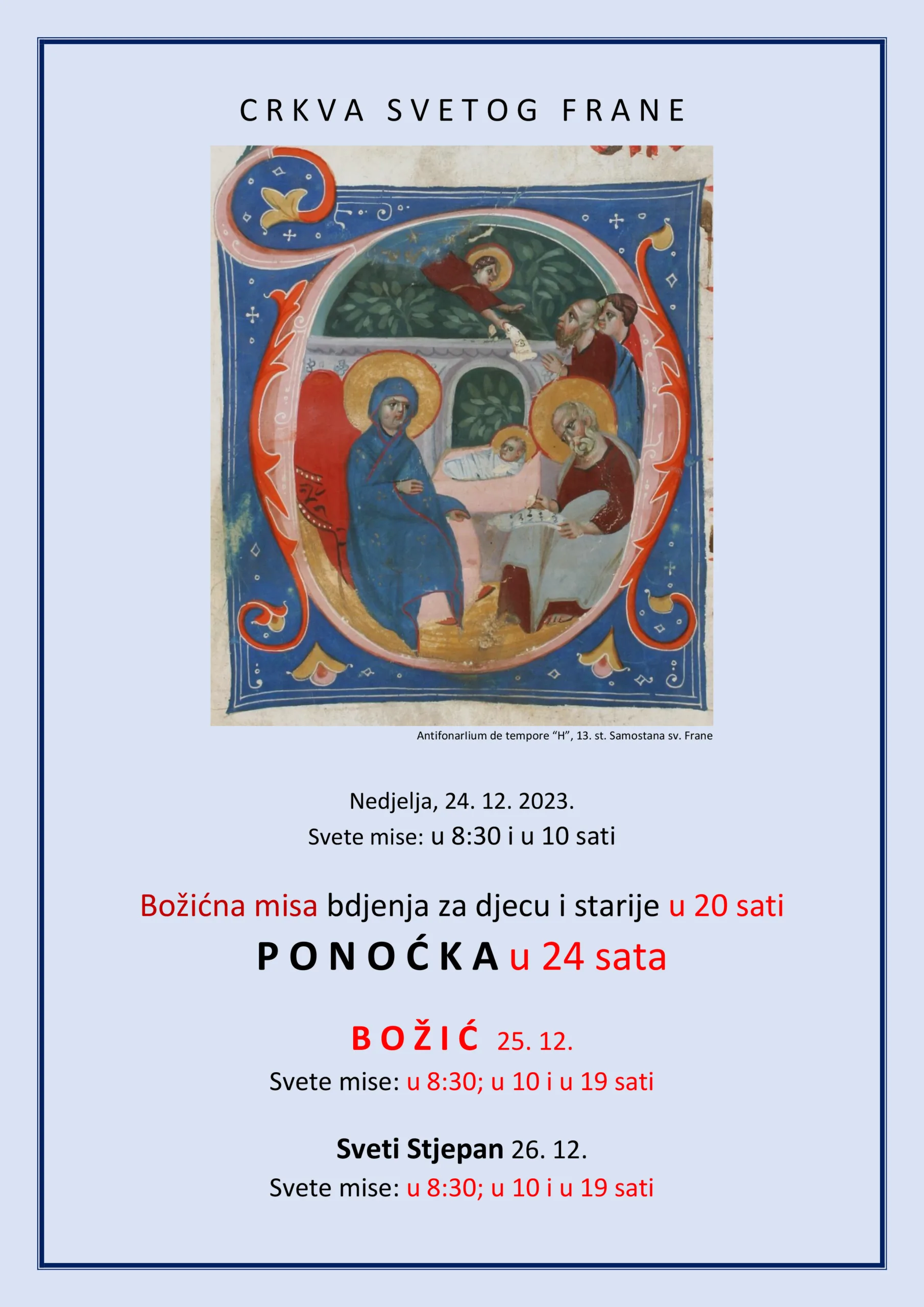 U Crkvi Sv. Frane na četvrtu nedjelju došašća, 24. prosinca, svete mise bit će slavljene u 8:30 i u 10 sati. (Neće biti svete mise u 19 sati).