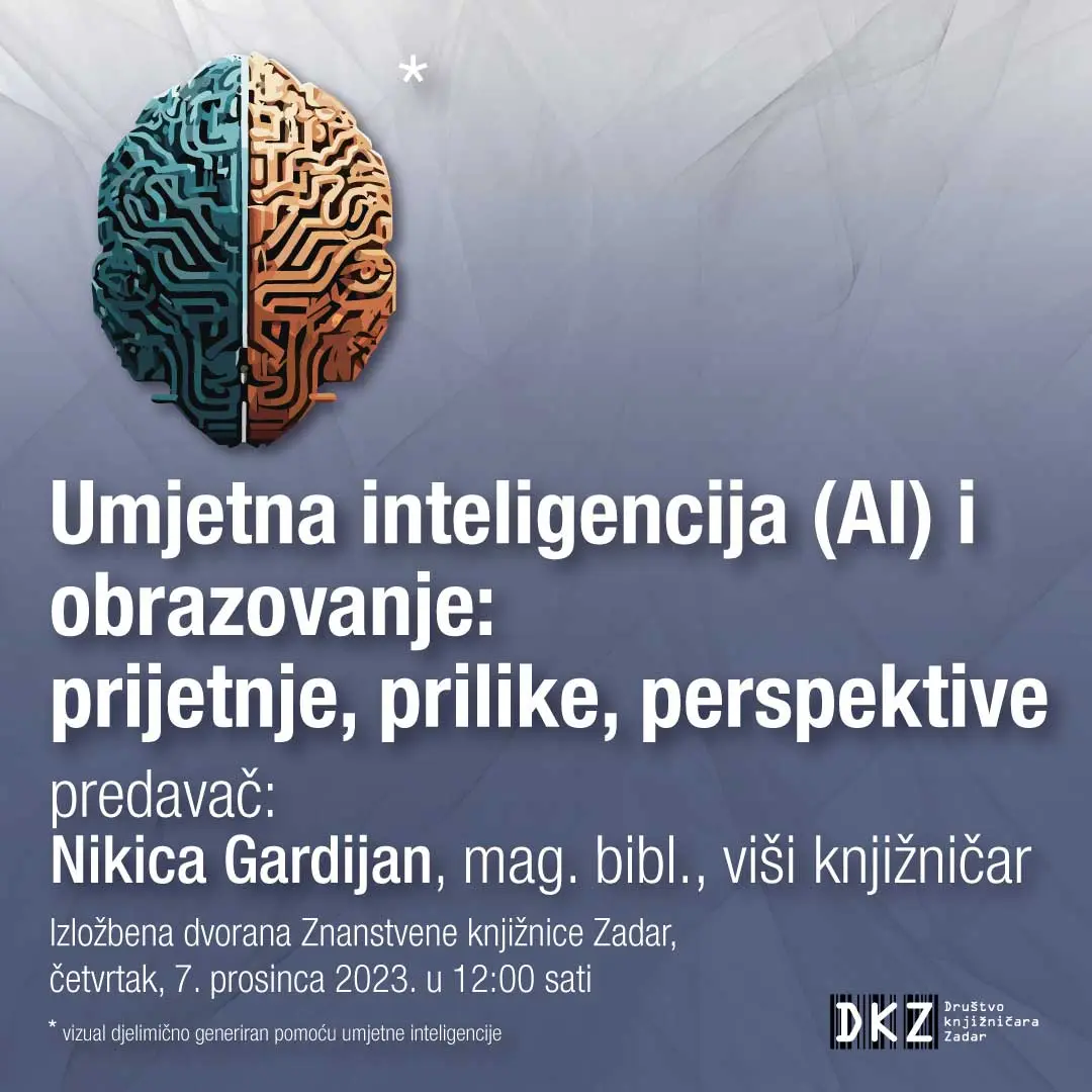 Društvo knjižničara Zadar poziva vas na javno predavanje pod naslovom „Umjetna inteligencija (AI) i obrazovanje: prijetnje, prilike, perspektive“ koje će se održati u četvrtak, 7. prosinca 2023. u 12 sati u izložbenoj dvorani Znanstvene knjižnice Zadar.