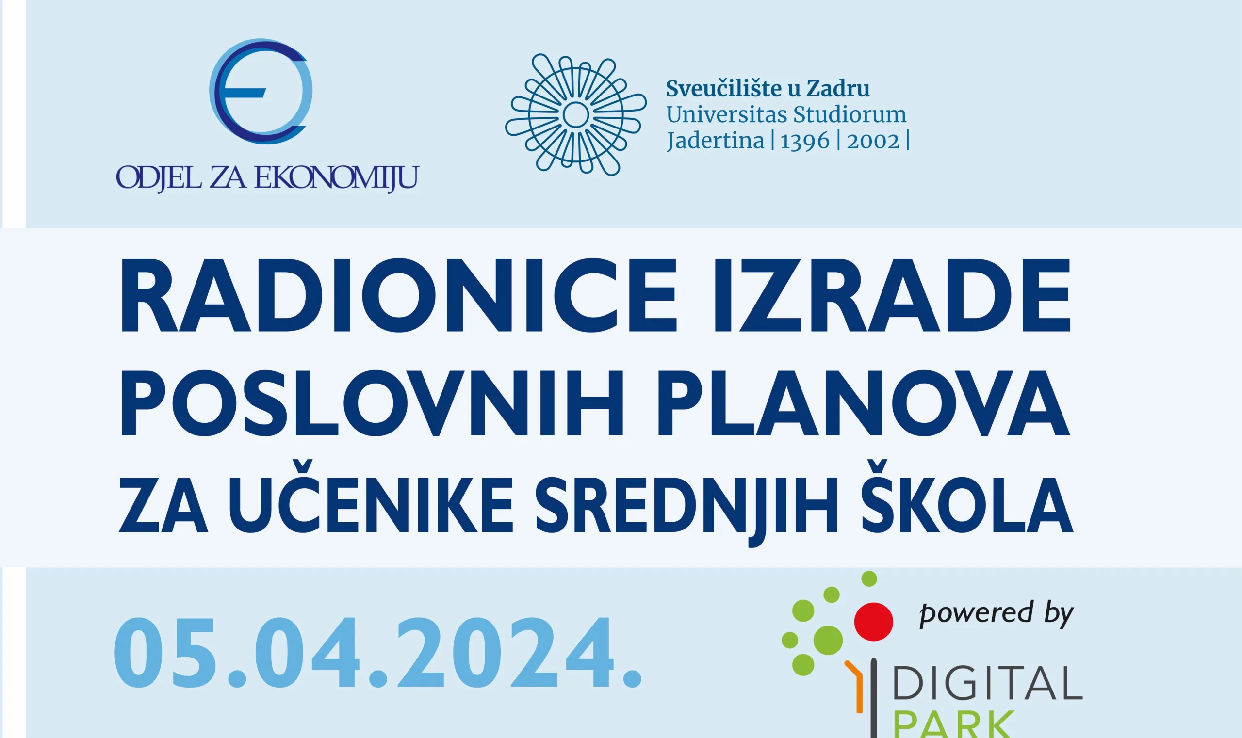 Pozivaju se učenici srednjih škola da se prijave na radionice izrade poslovnih planova u organizaciji Odjela za ekonomiju Sveučilišta u Zadru i tvrtke Digital park koja se bavi digitalnim vanjskim oglašavanjem. Radionice će se održati 05. travnja 2024. na Odjelu za ekonomiju, Splitska ulica 1.