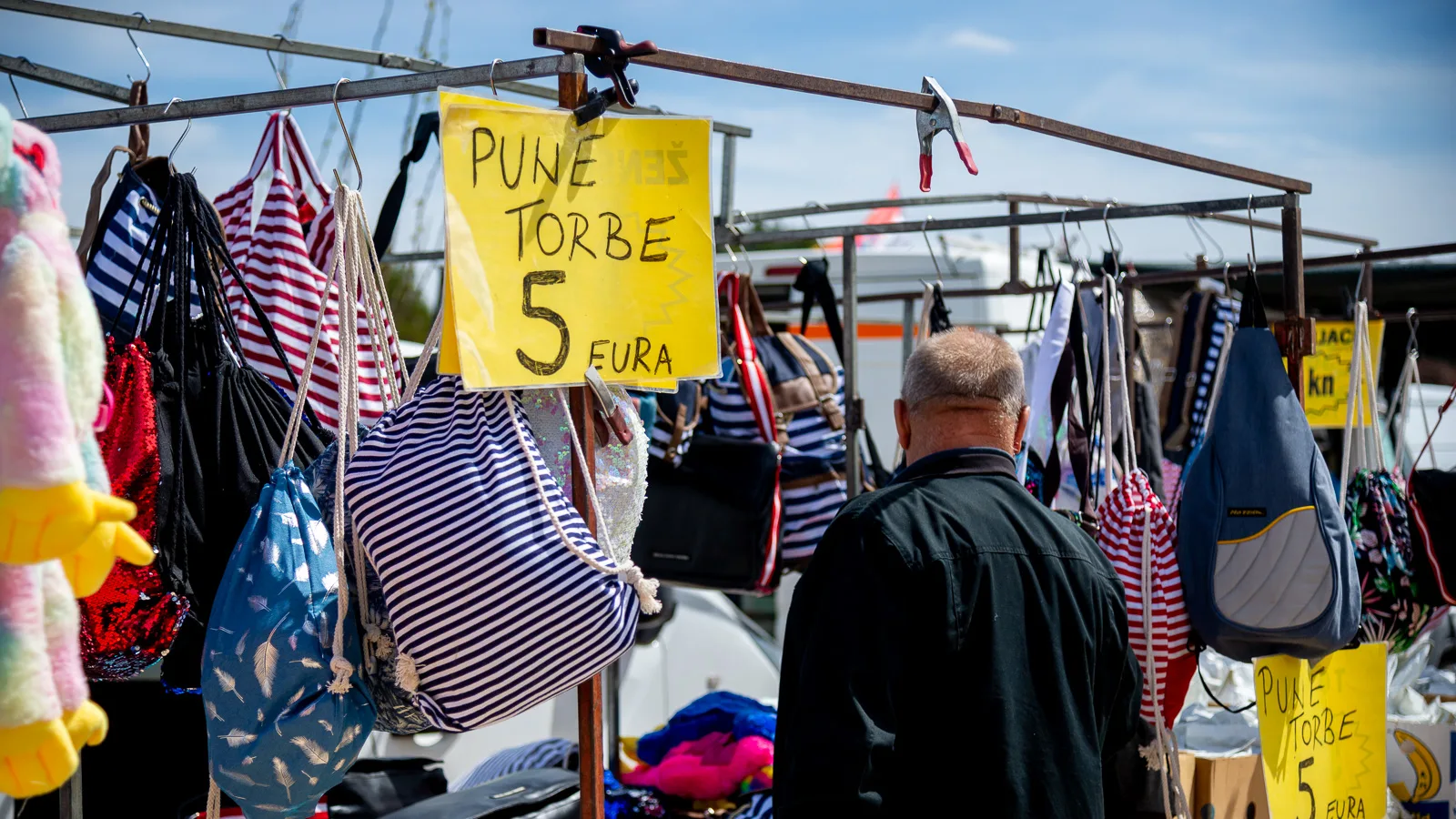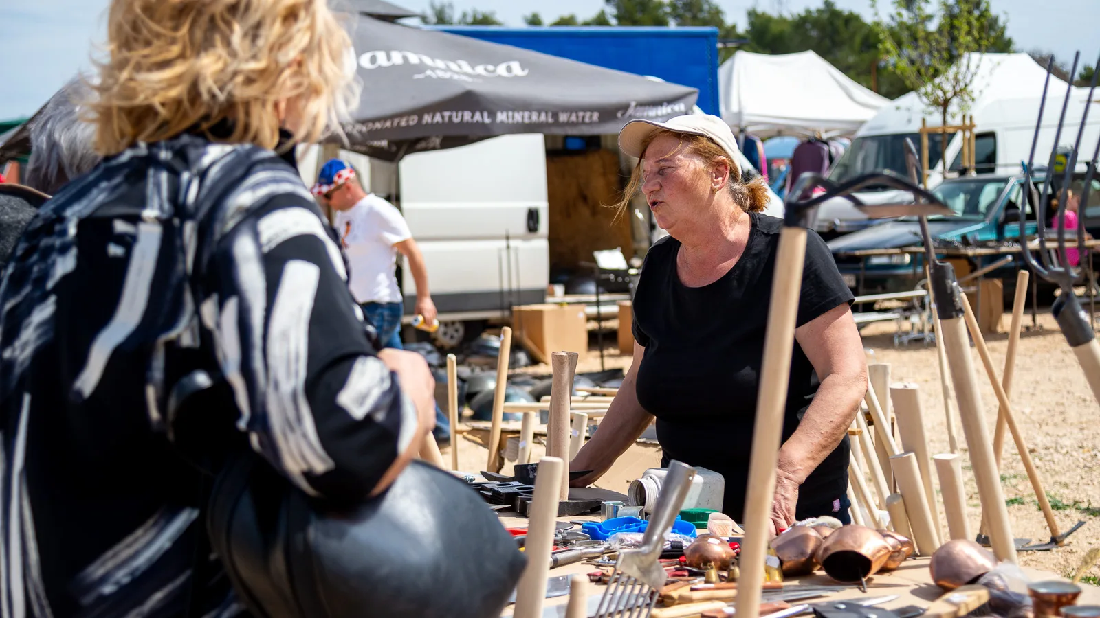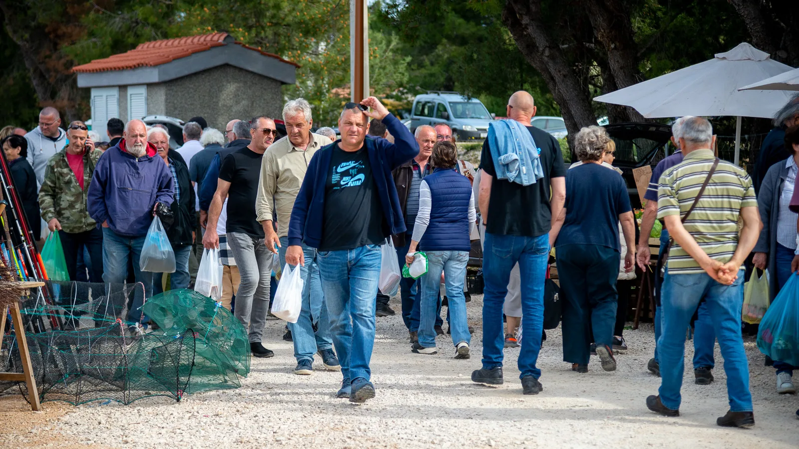 Duga rijeka posjetitelja sijevala se odasvud, sunce je pržilo ali to nikome nije smetalo, pogledavalo se pomno lijevo, desno, zbrajalo, računalo, dogovaralo, pregovaralo, za gradela, peku, luk, kapulu, sir, med, pletivo, opremu za ribolov, elektroniku, korejsku i kinesku digitalu, šlape, majicu, rabljeni i novi namještaj…
