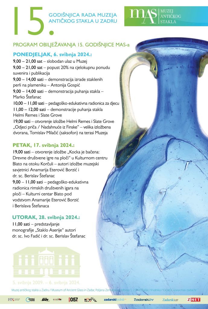 S velikim zadovoljstvom najavljujemo bogat i zabavan program koji smo pripremili u sklopu obilježavanja 15. godišnjice rada i Dana Muzeja antičkog stakla u Zadru, poručuju iz MAS-a.