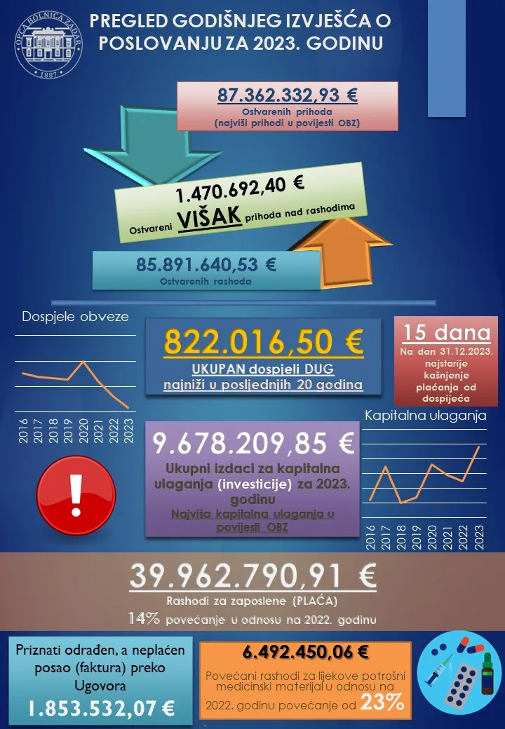 Opća bolnica Zadar je tijekom 2023. godine nastavila poslovati prilagođavajući se novim uvjetima, a ujedno nastavljajući pružati dostupnu i kvalitetnu javnozdravstvenu zaštitu.