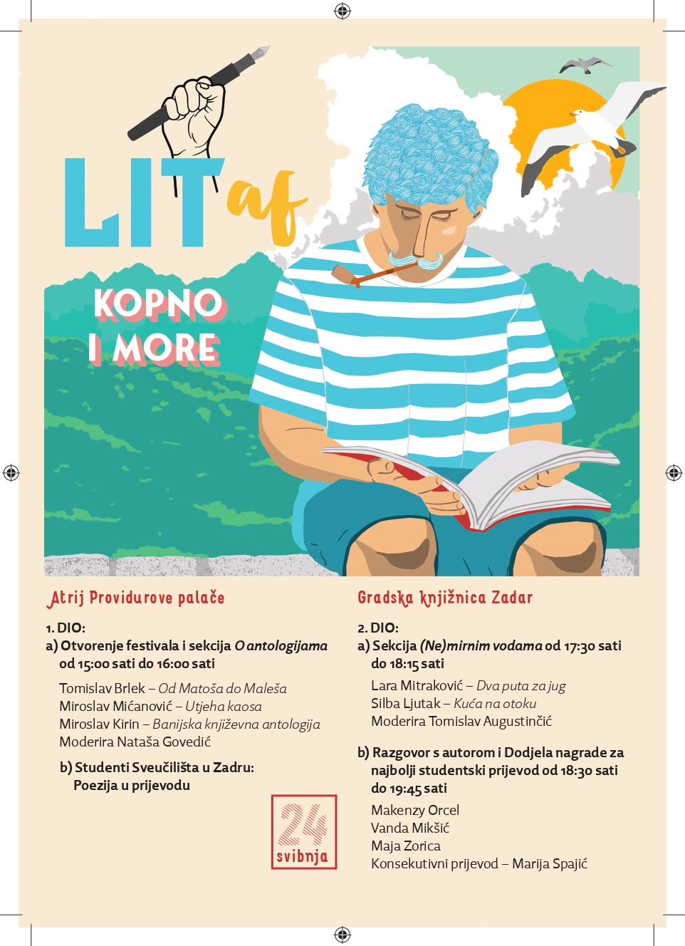 LITaf 2024., pod krovnom temom „Kopno i more“ kreće u nove pustolovine s likovima iz suvremenih hrvatskih djela, a premijerno i stranih autora. Kako okolina utječe na likove i njihove međusobne odnose i kako se autori koriste prostorom, kopnenim ili onim morskim, da bi nam približili njihove misli, emocije i dvojbe, kroz trodnevni program otkrivat će nam suvremeni pisci, spisateljice, pjesnici i pjesnikinje.