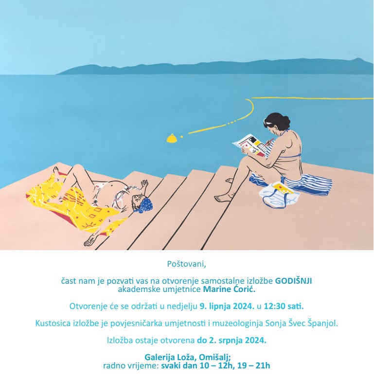 Pola sata nakon, dakle, u 12:30 sati održat će se otvorenje samostalne izložbe “Godišnji” akademske umjetnice Marine Ćorić u Galeriji Loža. Autorica će se predstaviti recentnim ciklusom radova izvedenih u tehnici akrila na papiru koji broji ukupno 18 radova. Još od vremena studija umjetnica je predano gradila i nadopunjavala ciklus autoportreta naglašeno introspektivnog karaktera komunicirajući sve one misli, stanja i emocije koje nije mogla verbalizirati. Ciklus koji je sustavno nadograđivala i razvijala od 2015. do 2019. godine došao je do svojevrsnog zasićenja jer su određeni životni procesi, emotivna stanja i promjene poimanja sebe kod umjetnice rezultirali činjenicom da polje realizacije više nije bilo površina platna već um umjetnice. Povratak na iskonske postavke omogućio je realizaciju novog ciklusa radova pod nazivom „Godišnji”. Marina Ćorić intuitivno je prepoznala i osjetila pravi trenutak za stilski i tematski odmak od dosadašnjih slikarskih radova, te je iznjedrila posve svjež, vedar i neposredan ciklus radova čiji naziv aludira, kako sâma umjetnica kaže, na njezin „odmor” od nje same tj. teme autoportreta i njezinog dosadašnjeg stila, ali i doslovno vizualizira (ne)aktivnosti na godišnjem odmoru.
