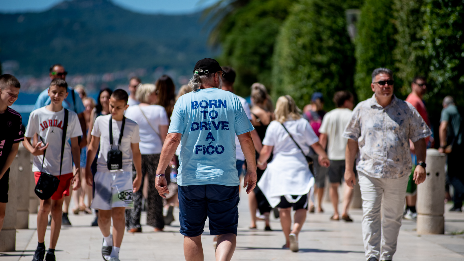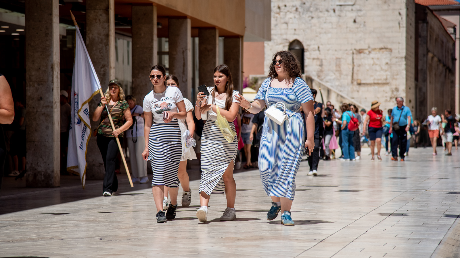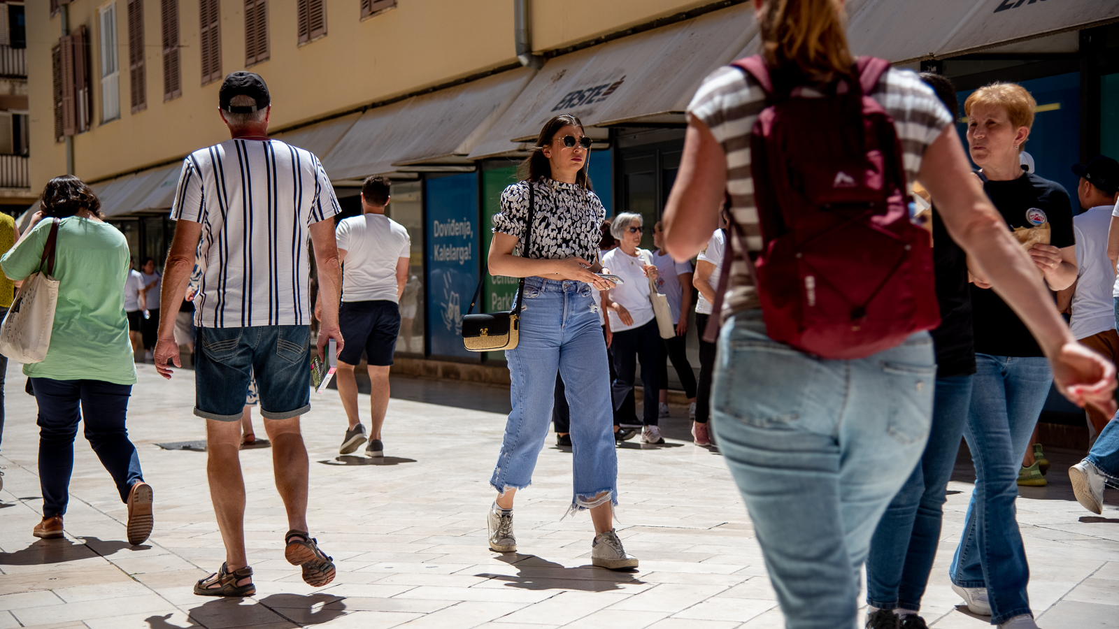 Pa prošeta, proćakula, susretne  poteštata, folklorašicu i folkloraša, hodače u odmoru, pokojeg vojaka, kolica, torbice, mater, ćaću, masu turista…