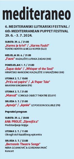 Ovoga ljeta, od 29. lipnja do 3. srpnja, održat će se 6. izdanje mediteranskog lutkarskog festivala pod nazivom “Mediteraneo”.