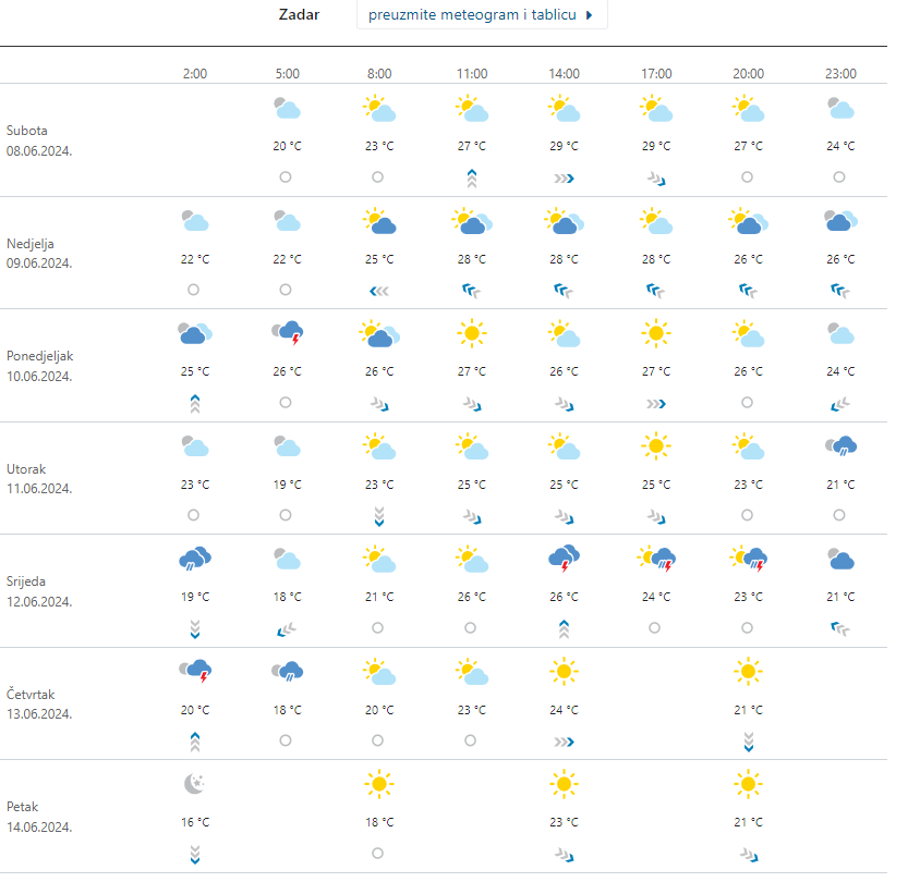 Pretežno sunčano, vrlo toplo i vruće prognoza je za subotu kada su u pitanju Dalmacija, odnosno Zadar i okolica. Vjetar slab do umjereni jugozapadni, anajviša temperatura zraka između 28 i 32 °Celzija.