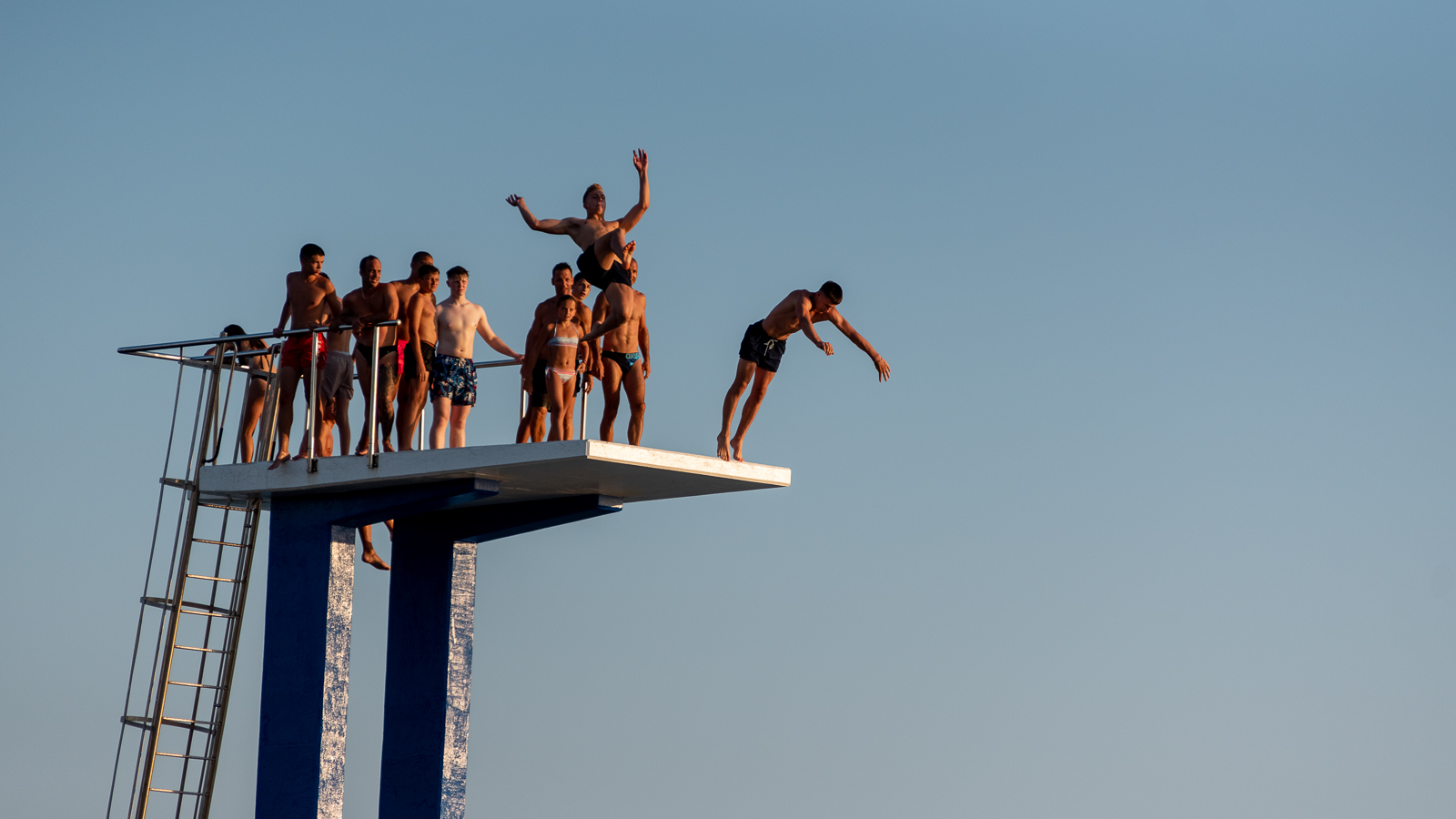 Bazen na Kolovarama ujedno je i važno mjesto za vaterpoliste koje smo danas imali prilike sresti u napornom treningu. Naravno, bilo je tu i mnoštvo kupača kojima ni skokovi ni vaterpolo nisu “đir”, već su došli večer provesti na moru uz zalazak Sunca.