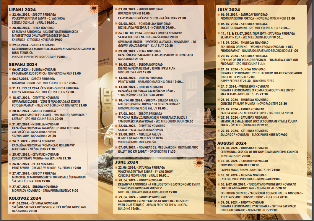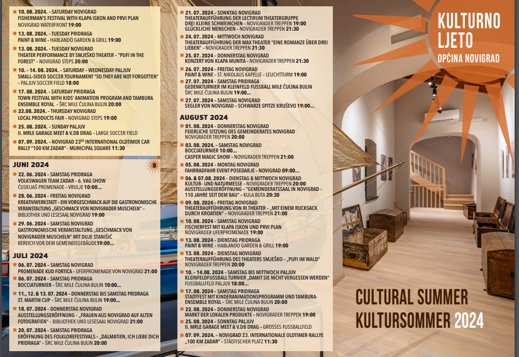 Općina i TZ Novigrad pripremili su i ove godine bogat, raznovrstan, zanimljiv, atraktivan i privlačan kulturno-zabavni i sportski program. Čitav niz je događanja prilagođenih svim uzrastima, generacijama, od najmlađih do najstarijih, domaćima i turistima.