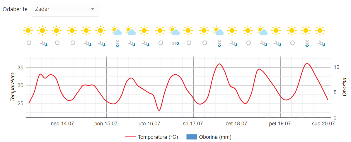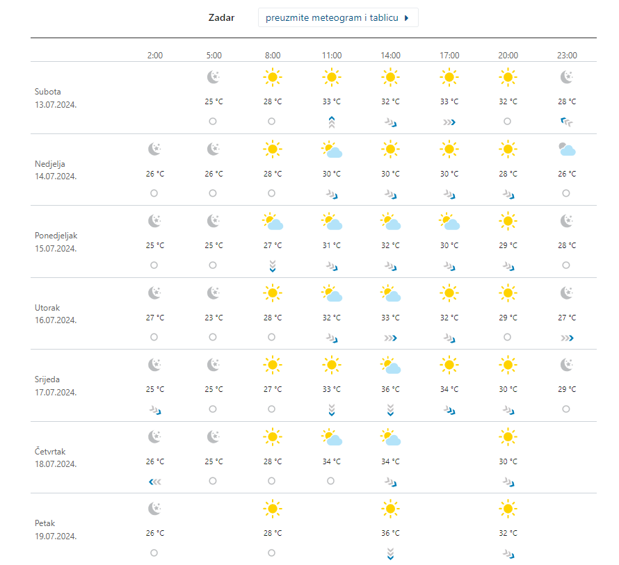Zadar i Zadarska županija? Pa zar ne vidite i ne osjećate, pretežno vedro, sunčano i vrlo vrlo vruće, vjetar slab, povremeno umjeren jugozapadni i sjeverozapadnjak. Najviša temperatura od 34 do 37 Celzijevih stupnjeva.