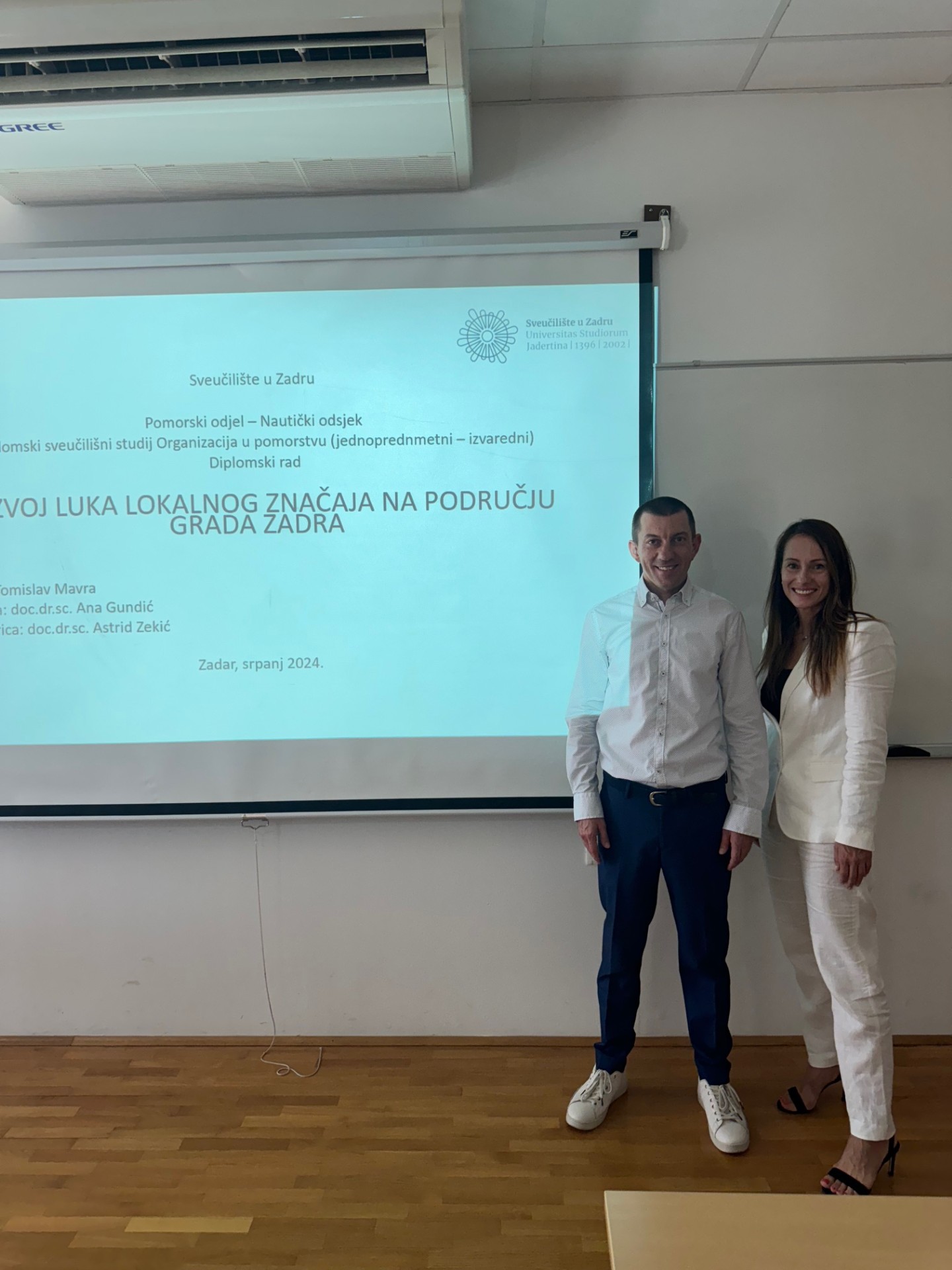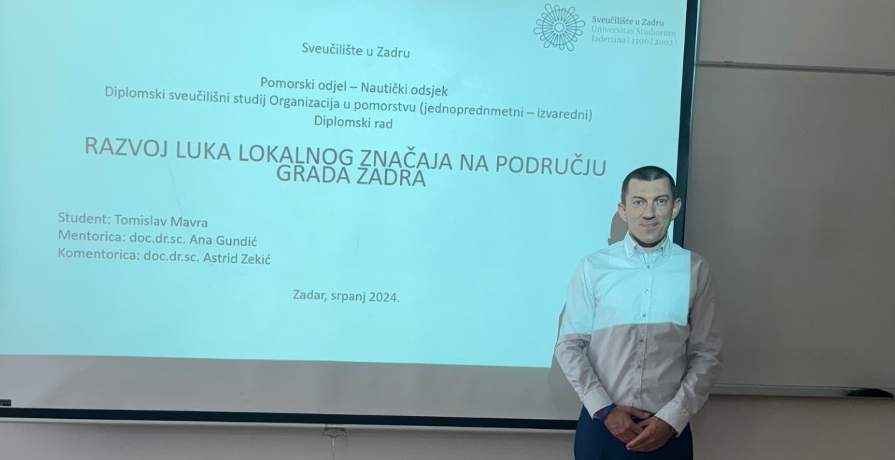 S osobitim zadovoljstvom iz Sveučilišta u Zadru istaknuli su kako je u petak, 5. srpnja 2024., diplomski rad na temu “Razvoj luka lokalnog značaja na području grada Zadra” obranio student prve generacije diplomskog studija “Organizacija u pomorstvu” Pomorski odjel – Sveučilište u Zadru, Tomislav Mavra.