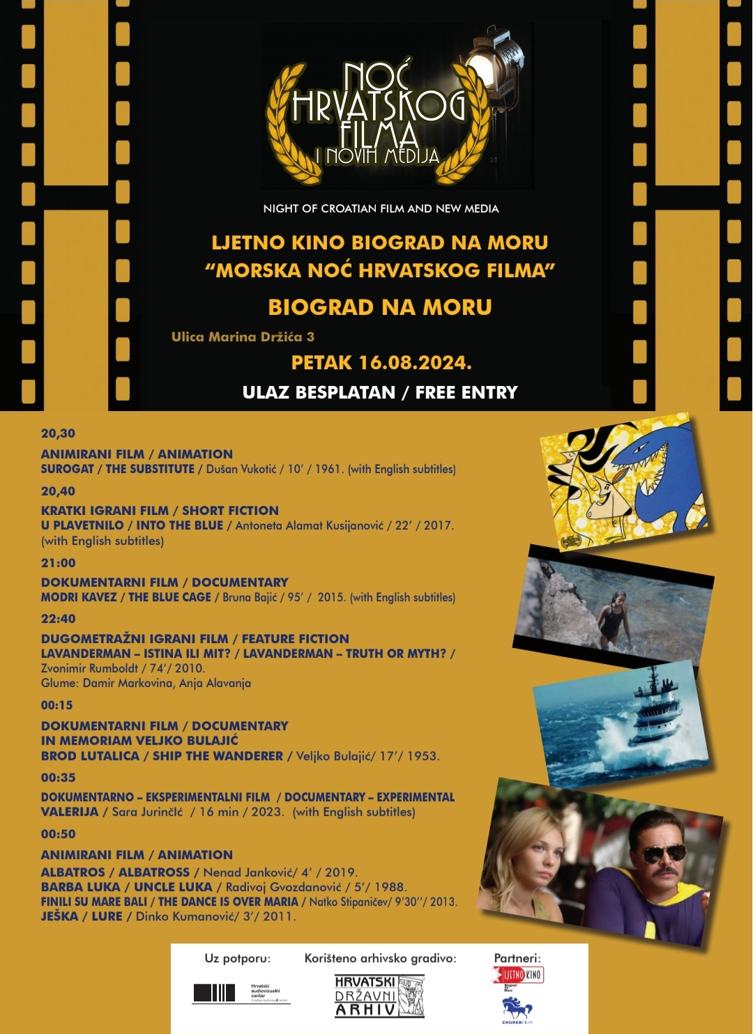 Program nastavljamo s dokumentarno-eksperimentalnim filmom „Valerija” Sare Jurinčić. Film je zamišljen kao intimni susret autorice i njenih pretkinja, inspiriran portretima s otočkog groblja gdje je uobičajeno da žene i muškaraci dok su još živi odlučuju o fotografiji koja će ih predstavljati na njihovom grobu nakon što umru. Finale ovogodišnje Noći hrvatskog filma i novog medija rezervirano je za animirani blok „morske tematike”. „Albatros” Nenada Jankovića o dokonim mornarima koji se ponekad sjete da za razonodu albatrose love, kad poput nehajnih suputnika lete oko lađa što nad gorkim jazom plove; „Barba Luka” Radivoja Gvozdanovića, „Finili su Mare bali” Natka Stipaničeva o dvoje ljudi koji žive sami na izoliranom otoku, te „Ješka” Dinka Kumanovića o moru, čovjeku i ribi…
