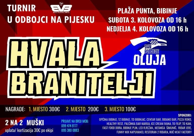 Klub odbojke na pijesku Bibinje – u subotu 3. kolovoza od 16 sati te u nedjelju 4.kolovoza od 16 sati, na plaži Punta – organizira turnir povodom obilježavanja VRO Oluja.