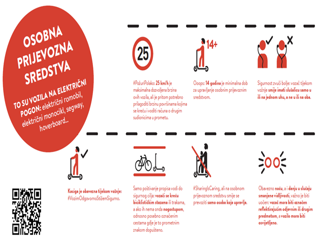 Tijekom ljetnih mjeseci na našim prometnicama pojačano je sudjelovanje u prometu vozača osobnih prijevoznih sredstava i biciklista, te zbog toga podsjećamo ovu kategoriju sudionika u prometu da se pridržavaju zakonskih propisa kojima je regulirano njihovo ponašanje prilikom sudjelovanja u prometu, a u cilju njihove osobne sigurnosti i sigurnosti drugih sudionika cestovnog prometa.