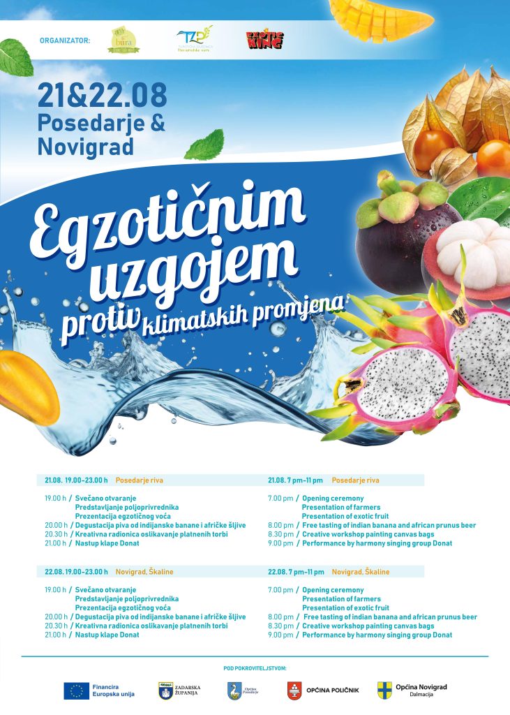 Pridružite se sajmu u Posedarju i Novigradu dana 21. i 22.8.2024. u Posedarju i Novigradu od 19 h. Organizatori sajma LAG Bura, TZ Novigradsko more i Exotic King d.o.o. pozivaju da otkrijete kako “Egzotičnim uzgojem protiv klimatskih promjena” možemo zajedno napraviti razliku. Na sajmu će biti i predstavljeni i domaći autohtoni proizvodi te ekološko egzotično voće uzgojeno u Hrvatskoj. Pokrovitelji sajma su Europska Unija, Zadarska županija, općine Novigrad, Posedarje, i Poličnik.