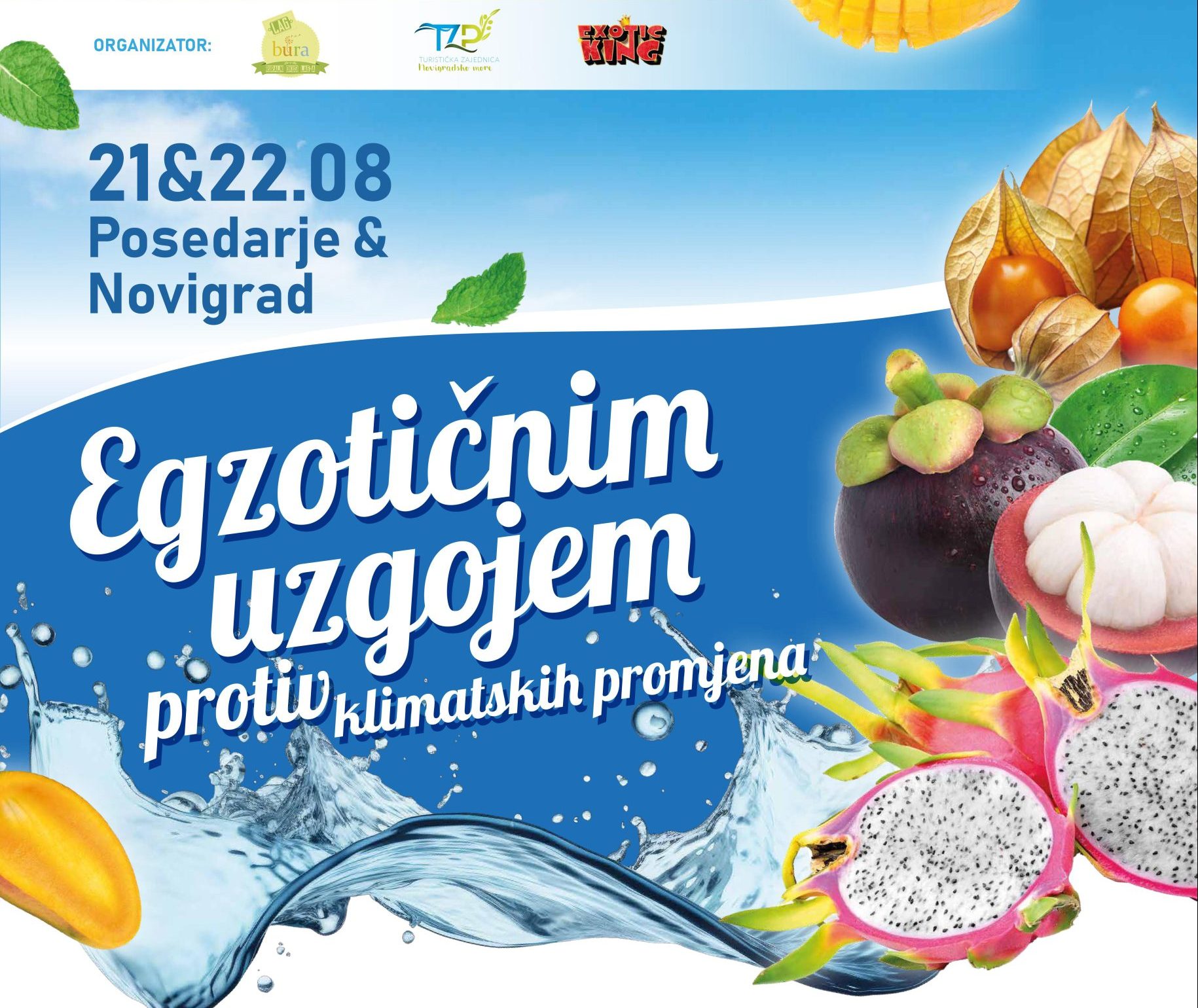 Pridružite se sajmu u Posedarju i Novigradu dana 21. i 22.8.2024. u Posedarju i Novigradu od 19 h. Organizatori sajma LAG Bura, TZ Novigradsko more i Exotic King d.o.o. pozivaju da otkrijete kako “Egzotičnim uzgojem protiv klimatskih promjena” možemo zajedno napraviti razliku. Na sajmu će biti i predstavljeni i domaći autohtoni proizvodi te ekološko egzotično voće uzgojeno u Hrvatskoj. Pokrovitelji sajma su Europska Unija, Zadarska županija, općine Novigrad, Posedarje, i Poličnik.