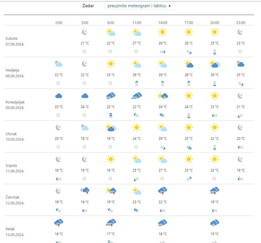 Dalmaciju, dakle Zadar čeka većinom sunčano, vrlo toplo i vruće, popodnevni razvoj oblaka vjerojatan je u unutrašnjosti gdje tek lokalno može biti i pokojeg pljuska. Vjetar slab do umjeren sjeverozapadni, uz samu obalu i jugozapadni, najviša dnevna temperatura između 27 i 31, najavljuju iz DHMZ-a.