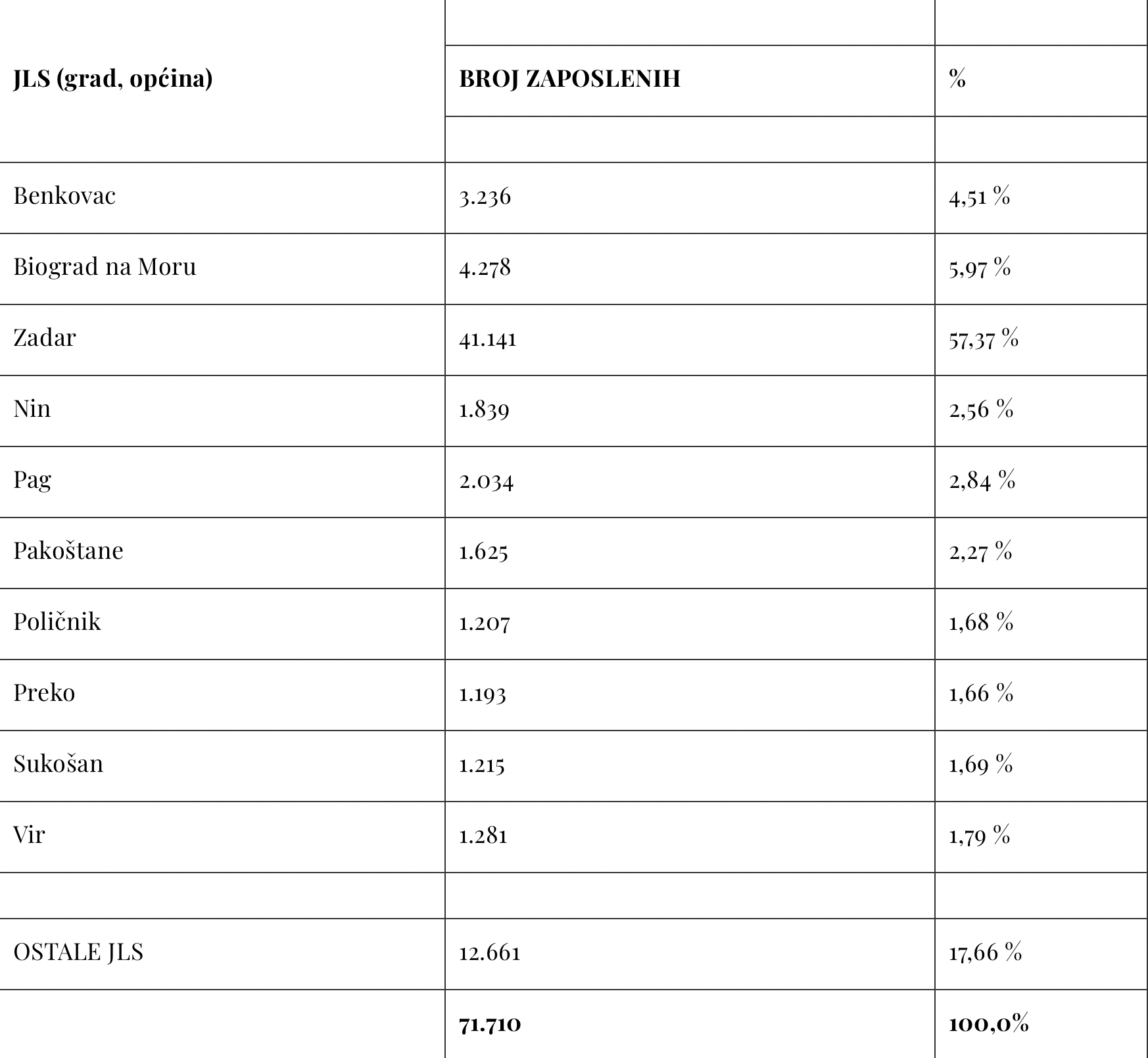 Ako se gleda zaposlenost po gradovima i općinama, više od dvije trećine radnog stanovništva raspoređeno je u tri najveća grada – Zadru, Biogradu i Benkovcu. Od ukupnog broja zaposlenih u srpnju, njih 41.141 ili 57,37 posto zaposleno je u sjedištu županije, gradu Zadru. Slijede gradovi Biograd (4.278), Benkovac (3.236), Pag (2.034) i Nin (1.839) te općine Pakoštane (1.625), Vir (1.281), Sukošan (1.215), Poličnik (1.207) i Preko sa 1.193 zaposlenih osoba.