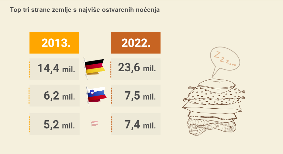 Zanimljivo, ako usporedimo godinu ulaska Hrvatske u Europsku uniju s podacima za 2022., vidimo da su u obje godine najvjerniji gosti bili Nijemci, koji su, od stranih turista, ostvarili najviše noćenja, a slijede ih Slovenci i Austrijanci.