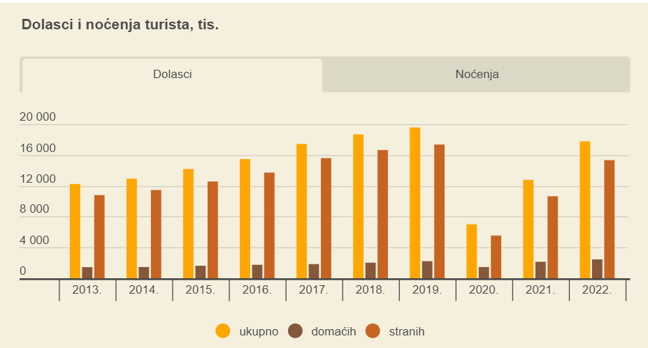 U povodu obilježavanja Svjetskog dana turizma u nastavku donosimo pregled turističkih pokazatelja, a ono što se iz podataka odmah može zaključiti jest da su dolasci i noćenja turista u proteklom desetljeću bili u kontinuiranom porastu, s iznimkom pandemijske 2020. Prema posljednjim raspoloživim godišnjim podacima, godina 2022., u kojoj je zabilježeno 90,0 milijuna noćenja, gotovo je dosegnula brojke pretpandemijske 2019., no broj dolazaka i dalje je nešto manji nego tada.