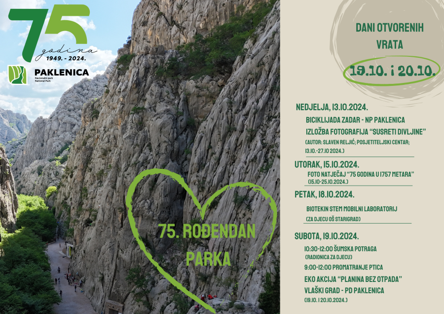 Nacionalni park Paklenica drugi je najstariji nacionalni park u Hrvatskoj, tek nekoliko mjeseci mlađi od Nacionalnog parka Plitvička jezera, a u subotu 19.10. obilježavamo 75. rođendan NP Paklenica!