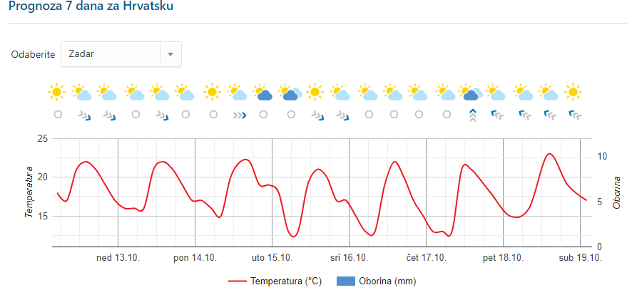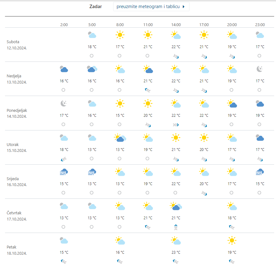 Dakle, u Zadru i ZD županiji, pred nama je pretežno sunčano, uz slabu do umjerenu buru, potom sjeverozapadnjak, uz obalu i jugozapadnjak. Najviša dnevna temperatura zraka između 21 i 25 Celzijevih stupnjeva.