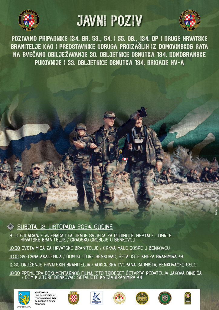 U organizaciji Koordinacije udruga proizišlih iz Domovinskog rata za područje Benkovca i ratnih zapovjednika brigadira Rodoljuba Barića i pukovnika Josipa Čerine, u subotu, 12. listopada održat će se svečano obilježavanje 33. obljetnice osnivanja 134. brigade i 30. Obljetnice osnivanja 134. domobranske pukovnije Hrvatske vojske, ali i ustrojavanja 53. , 54. i 55. domobranske bojne, pod pokroviteljstvom Grada Benkovca. Nakon gašenja brigade, u srpnju 1992. osnovane su domobranske bojne, a u kolovozu 1994. one su ušle u sastav pukovnije. Riječ je o hrvatskim braniteljima koji su upornom obranom obranili najplići dio bojišnice u Republici Hrvatskoj, prostor od Raštana Gornjih do Bile Vlake, širine 40 kilometara i dubine 5 – 8 kilometara, oko 250 četvornih kilometara prostora , naselja biogradskog i stankovačkog kraja i Jadransku magistralu.