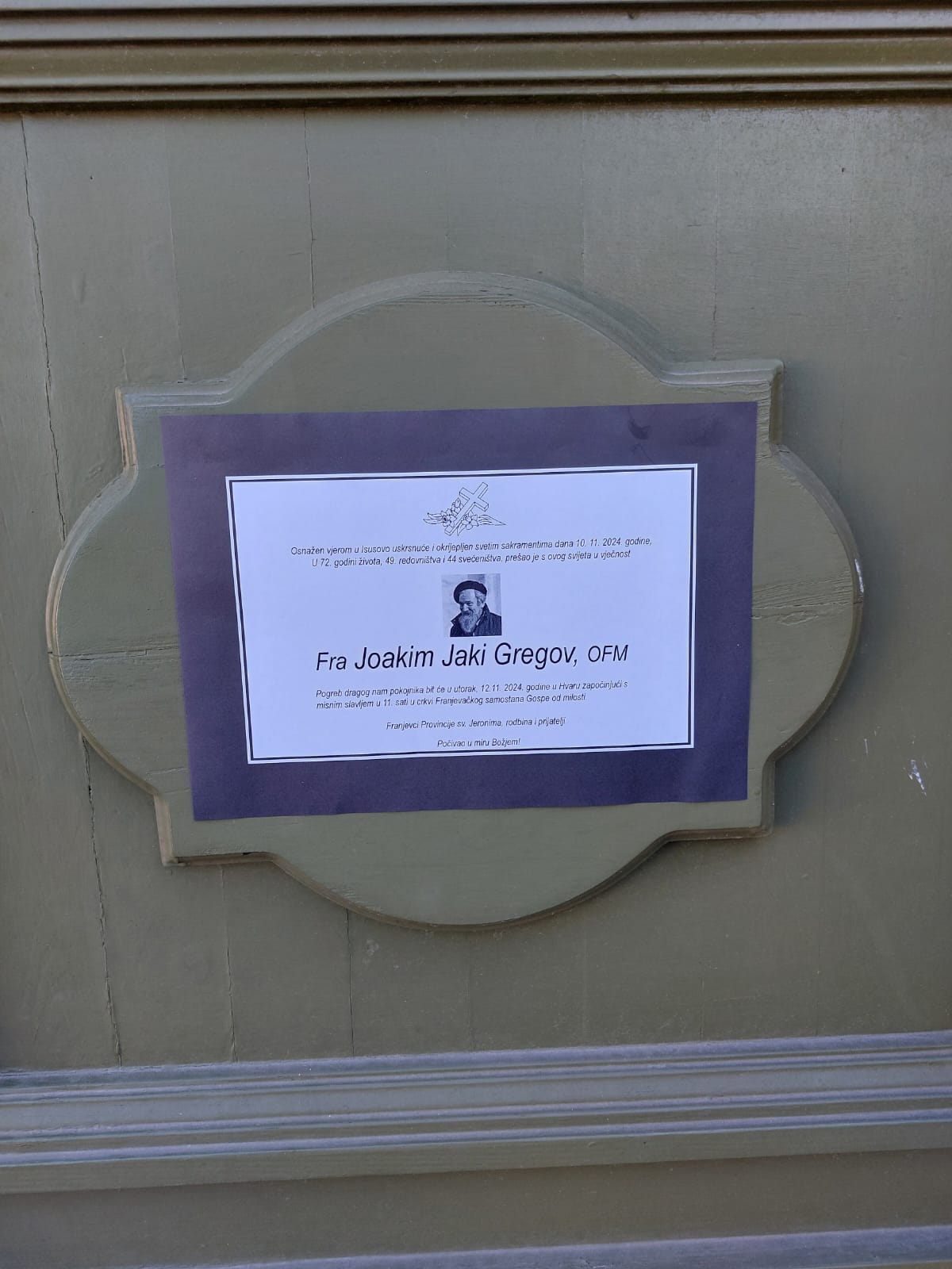 U Hvaru, u samostanskoj crkvi Gospe od Milosti, jučer 12. studenoga 2024. pokopan je fra Joakim Jaki Gregov. Euharistijsko slavlje vodio je mons. Ranko Vidović hvarski biskup u prisutnosti velikog broja svećenika. Posebno se dotakao autentičnog vjerskog, redovničkog i svećeničkog života fra Joakima i milosrđa koje ga krasilo.