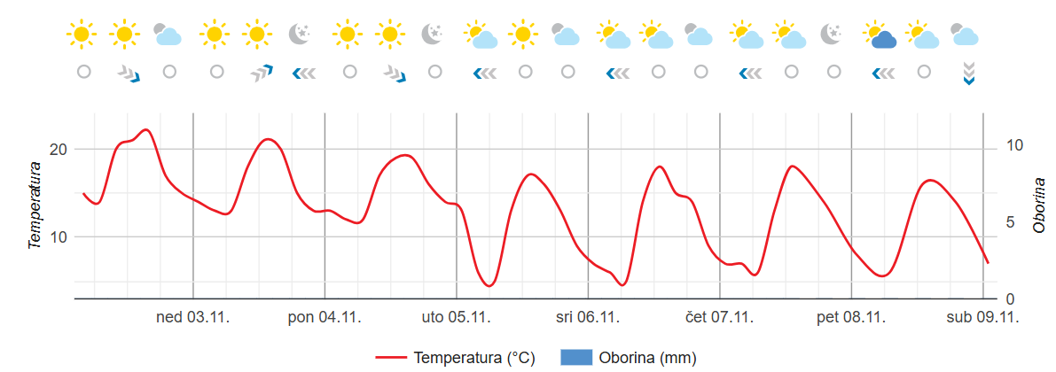 Cijeli sljedeći tjedan moralo bi prevladavati pretežno sunčano, u kotlinama zaobalja- jutarnja magla. Danju će biti toplo iako nešto manje u odnosu na ove dana, većinom od 17 do 22°Celzija, a jutra će biti 3 do 5 stupnjeva hladnija u odnosu na aktualne vrijednosti temperatura zraka. Kapute, lumbrele, debele čarape, čizme, ili što li već ste izvadili iz ormara- vratite za sada natrag… (PL)