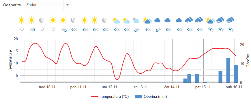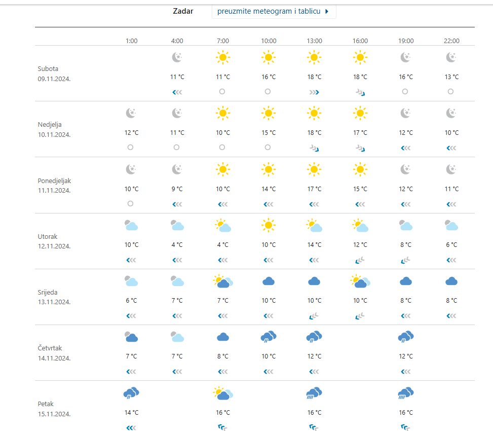 U srijedu -pretežno oblačno uz povremenu kišu, iznad 1500 metara bit će i- snijega. Puhat će jaka bura, podno Velebita olujna s orkanskim udarima. Na jugu Dalmacije levant i jugo, u većini predjela bit će osjetno hladnije, čak i ponegdje uz obalu danju ispod 10°C uz oborine i vjetar što će činiti prave kasnojesensku uvjete, a slično će prema raspoloživim sinoptičkim pokazateljima biti i sljedeća dva dana.