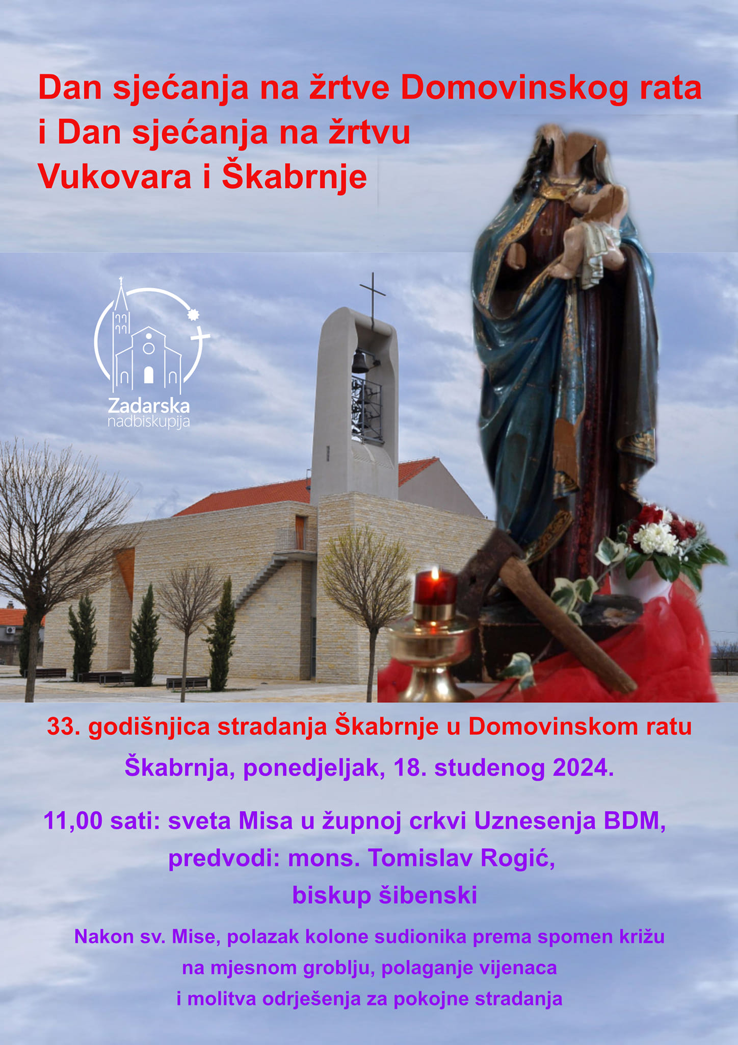 3.Na 33. godišnjicu stradanja Škabrnje u Domovinskom ratu, u ponedjeljak, 18. studenog, misu u župnoj crkvi Uznesenja BDM u Škabrnji u 11 sati predvodi šibenski biskup Tomislav Rogić.