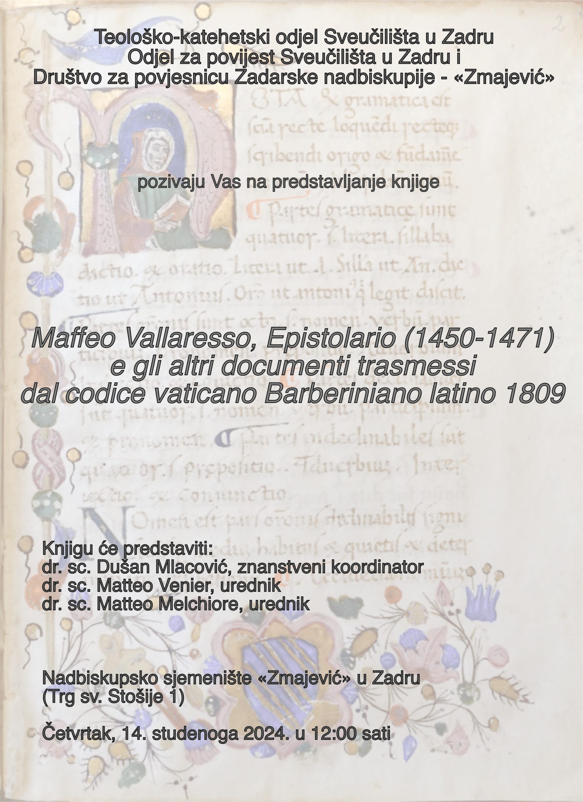 1.Predstavljanje knjige o korespondenciji zadarskog nadbiskupa i humaniste Maffea Vallaressa (1450. – 1496.) koja će doprinijeti daljnjem proučavanju njegovog života i djelovanja održava se u sjemeništu ‘Zmajević’ u Zadru u četvrtak, 14. studenoga, u 12 sati.