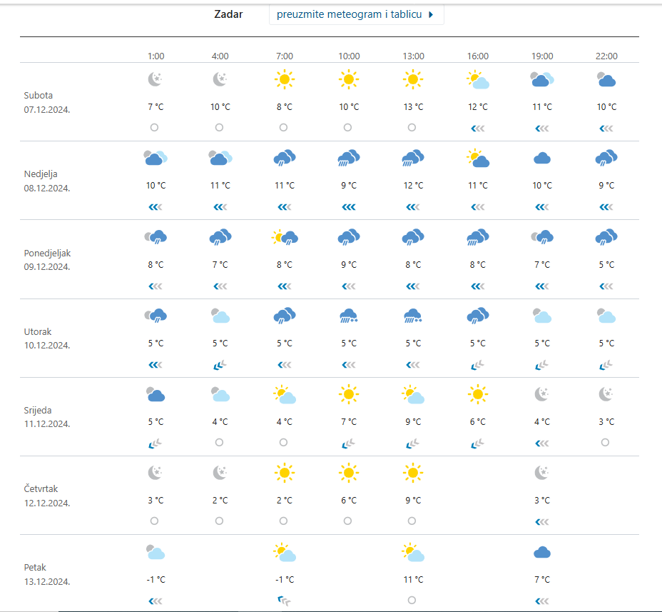 Pretežno sunčano, prema kraju dana porast naoblake vrijedi dakle i za Zadar. Puhat će umjerena bura i sjeverni vjetar, poslijepodne će slabjeti. Navečer će zapuhati jugo i jačati. Najviša dnevna temperatura između 10 i 15 Celzijevih stupnjeva.
