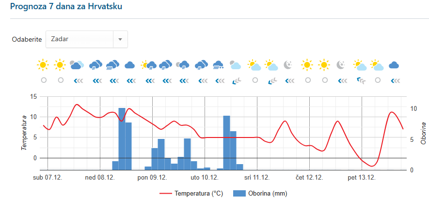 I onda kad prespavamo, velika promjena meteo-porilika. Promjenljivo, ponegdje i pretežno oblačno s povremenom oborinom najavljuje pak DHMZ za sutra. Na Jadranu kiša, lokalno i obilni pljuskovi s grmljavinom, u gorskoj Hrvatskoj susnježica i snijeg uz stvaranje snježnog pokrivača. U drugom dijelu dana kiša će se proširiti i na ostale predjele, prema kraju dana mjestimice će biti i snijega. Puhat će umjeren sjeveroistočni vjetar. Na Jadranu jako i olujno jugo, na sjevernom dijelu i bura, pod Velebitom -s orkanskim udarima. Poslijepodne će jugo u Dalmaciji malo oslabjeti. Najniža jutarnja temperatura zraka od -2 do 3, na Jadranu od 6 do 9, najviša dnevna većinom od 2 do 7, na Jadranu i unutrašnjosti Dalmacije od 8 do 13 °Celzija.