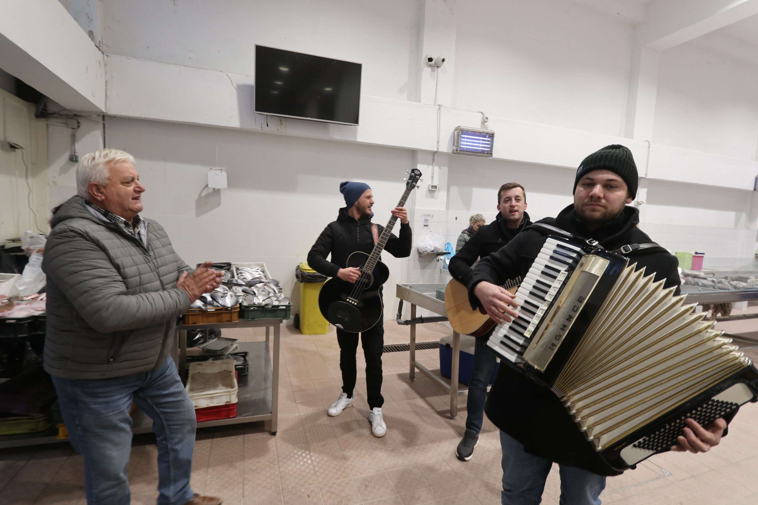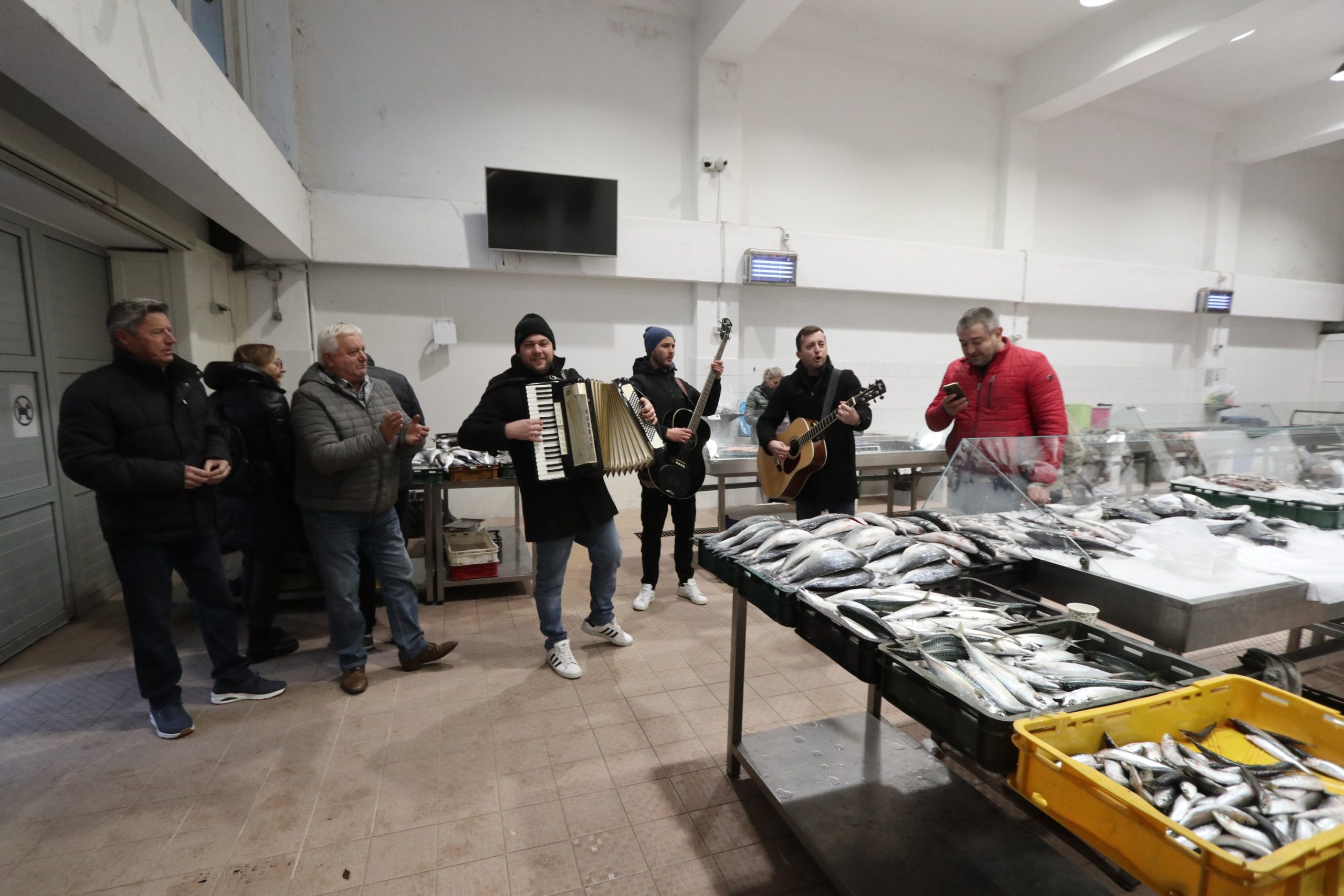 Za dobru zabavu pobrinuli su se dečki s gitarama i harmonikom te je, unatoč hladnom i vjetrovitom vremenu, na ribarnici jutros bilo veselo. A bilo je i nešto prodavača na štandovima s voćem i povrćem za sve one koju jučer nisu obavili spizu.