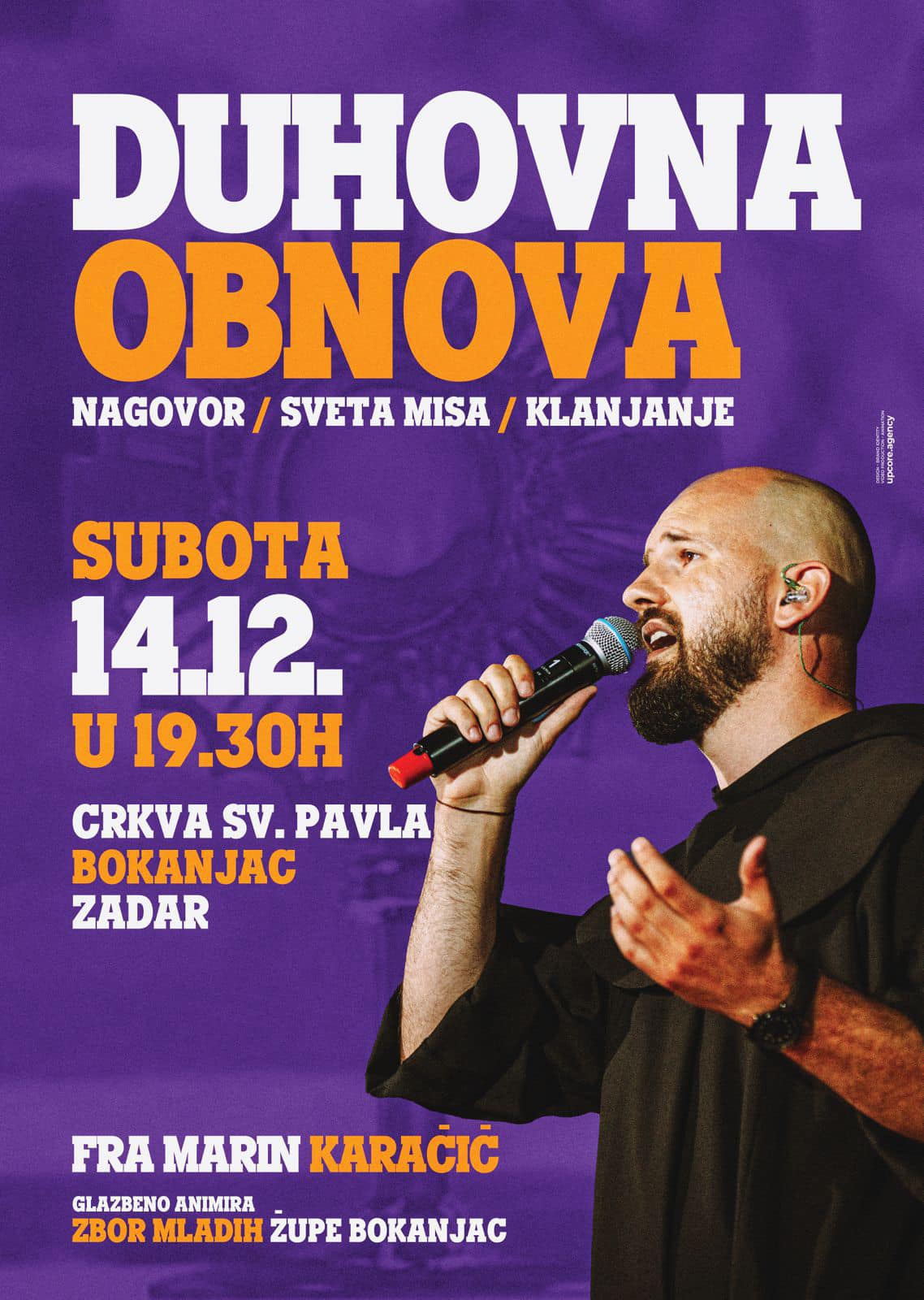 Fra Marin će održati nagovor, potom predvoditi misno slavlje i euharistijsko klanjanje, pjevanje animira Zbor mladih župe Bokanjac iz Zadra.